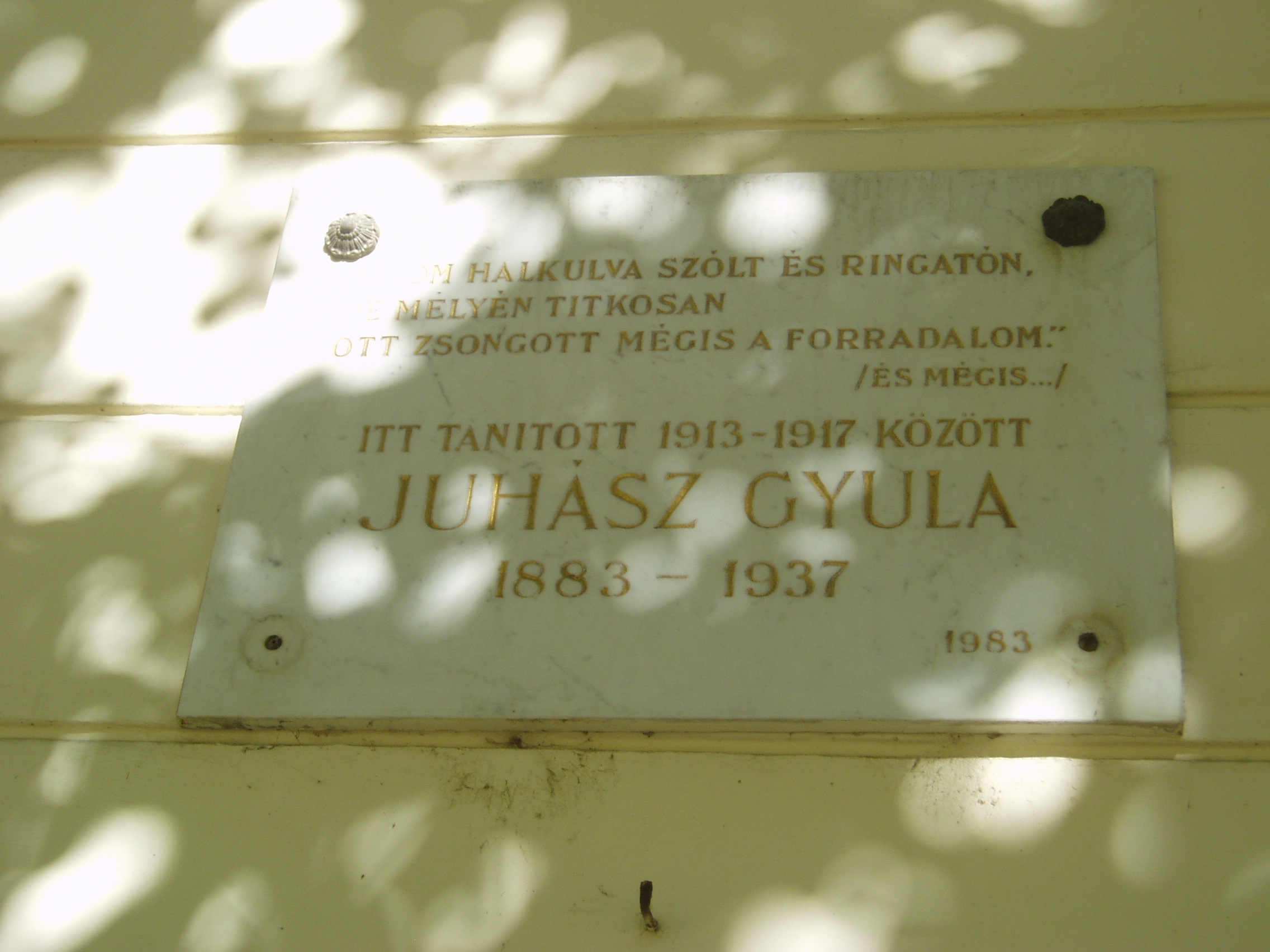 Nyilvános 1172 | 1650 | Makó, Csanád vezér tér 6. József Attila Gimnázium | A város központjából északra nyílik a sugárútszerű Csanád vezér tér. Nyugati oldalán áll a József Attila Gimnázium 1895-ben, eklektikus stílusban, Gerle Lajos tervei alapján emelt épülete. Itt tanított négy évig Juhász Gyula, itt tanult József Attila, majd Erdei Ferenc. A képen Juhász Gyula emléktáblája látható. Ő írta József Attila makói diák korában megjelent első verseskötetének prófétikus előszavát: "A legnagyobb készséggel és örömmel vállalkoztam arra, hogy József Attila első verses könyvéhez előszót írjak. Ez a nagyon fiatal és nagyon tehetséges költő a legteljesebb mértékben megérdemli, hogy a figyelem feléje forduljon, hogy igaz szeretettel és reménységgel fogadja a magyar olvasóközönség és hogy a kritika se menjen el mellette közömbösen vagy ellenségesen és ne elégedjék meg vele szemben a nyomtatásban megjelenőknek rendesen kijáró vállveregetéssel. József Attila Isten kegyelméből való költő." A fénykép 2007 júliusában készült. Felh. irod.: Barangolások Csongrád megyében. Miskolc, Well-PRess, 1997 |