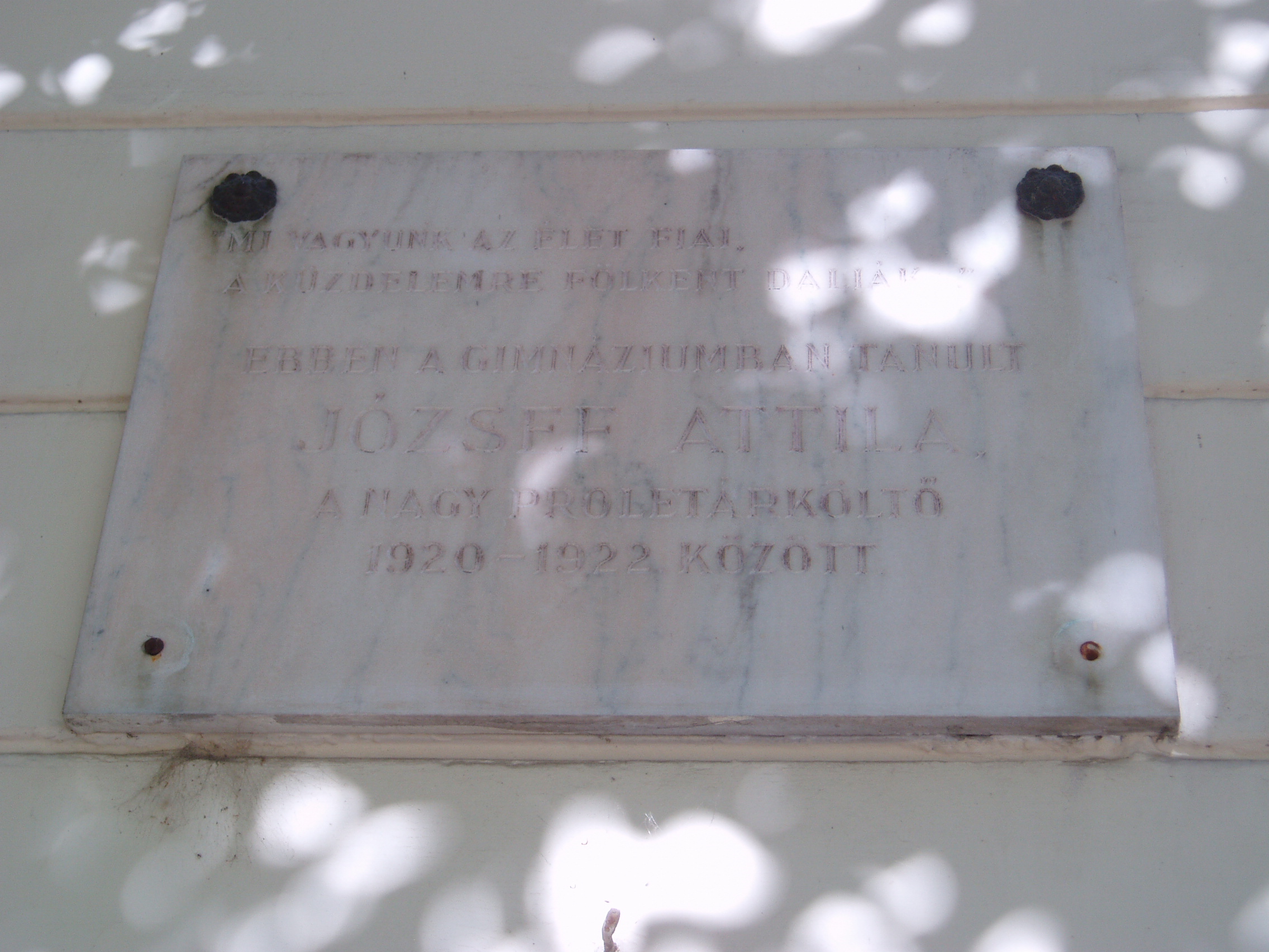 Nyilvános 1147 | 1702 | Makó, Csanád vezér tér 6. József Attila Gimnázium | A város központjából északra nyílik a sugárútszerű Csanád vezér tér. Nyugati oldalán áll a József Attila Gimnázium 1895-ben, eklektikus stílusban, Gerle Lajos tervei alapján emelt épülete. Itt tanított négy évig Juhász Gyula, itt tanult József Attila, majd Erdei Ferenc. A tizenöt és fél éves József Attila 1920 októberében érkezett Makóra. Verseire Juhász Gyula figyelt fel, akinek pártfogása révén a nyugat is közölt néhányat belőlük. Makói diák volt, amikor tizenhét éves korában Szegeden megjelent első verseskötete, a "Szépség koldusa", Juhász Gyula prófétikus előszavával: "A legnagyobb készséggel és örömmel vállalkoztam arra, hogy József Attila első verses könyvéhez előszót írjak. Ez a nagyon fiatal és nagyon tehetséges költő a legteljesebb mértékben megérdemli, hogy a figyelem feléje forduljon, hogy igaz szeretettel és reménységgel fogadja a magyar olvasóközönség és hogy a kritika se menjen el mellette közömbösen vagy ellenségesen és ne elégedjék meg vele szemben a nyomtatásban megjelenőknek rendesen kijáró vállveregetéssel. József Attila Isten kegyelméből való költő." Az épület előtt áll 2005-ben, születése centenáriumán újjáavatott szobra, a járdába ágyazottan pedig első verseskötetének bronzba öntött címlapja idézi emlékét. A fénykép 2007 júliusában készült. Felh. irod.: Barangolások Csongrád megyében. Miskolc, Well-PRess, 1997 |