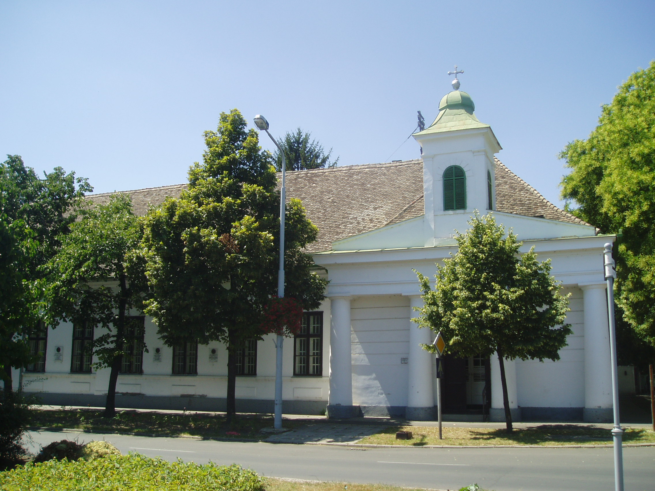 Nyilvános 1214 | 1666 | Makó, Csanád vezér tér 12. | A volt püspöki nyaralókastélyt a Temesvárott lakó Kőszeghy László csanádi püspök emeltette 1826-ban a hozzá csatlakozó dór oszlopos kápolnával együtt. Az alföldi klasszicizmusra oly jellemző, hosszú épületegyüttes megjelenését fokozzák párkány- és frízdíszei, valamint jó árnyékhatású koronázópárkánya. A külső homlokzaton jeles, az épülethez kötődő csanádi püspökök, illetve püspöki helynök emléktábláit helyezték el. A diákotthonként működő épület nyaranta a Rudnay Gyula munkásságának hagyományaira épülő nemzetközi művésztelepnek ad otthont. A fénykép 2007 júliusában készült. Felh. irod.: Barangolások Csongrád megyében. Miskolc, Well-PRess, 1997 |