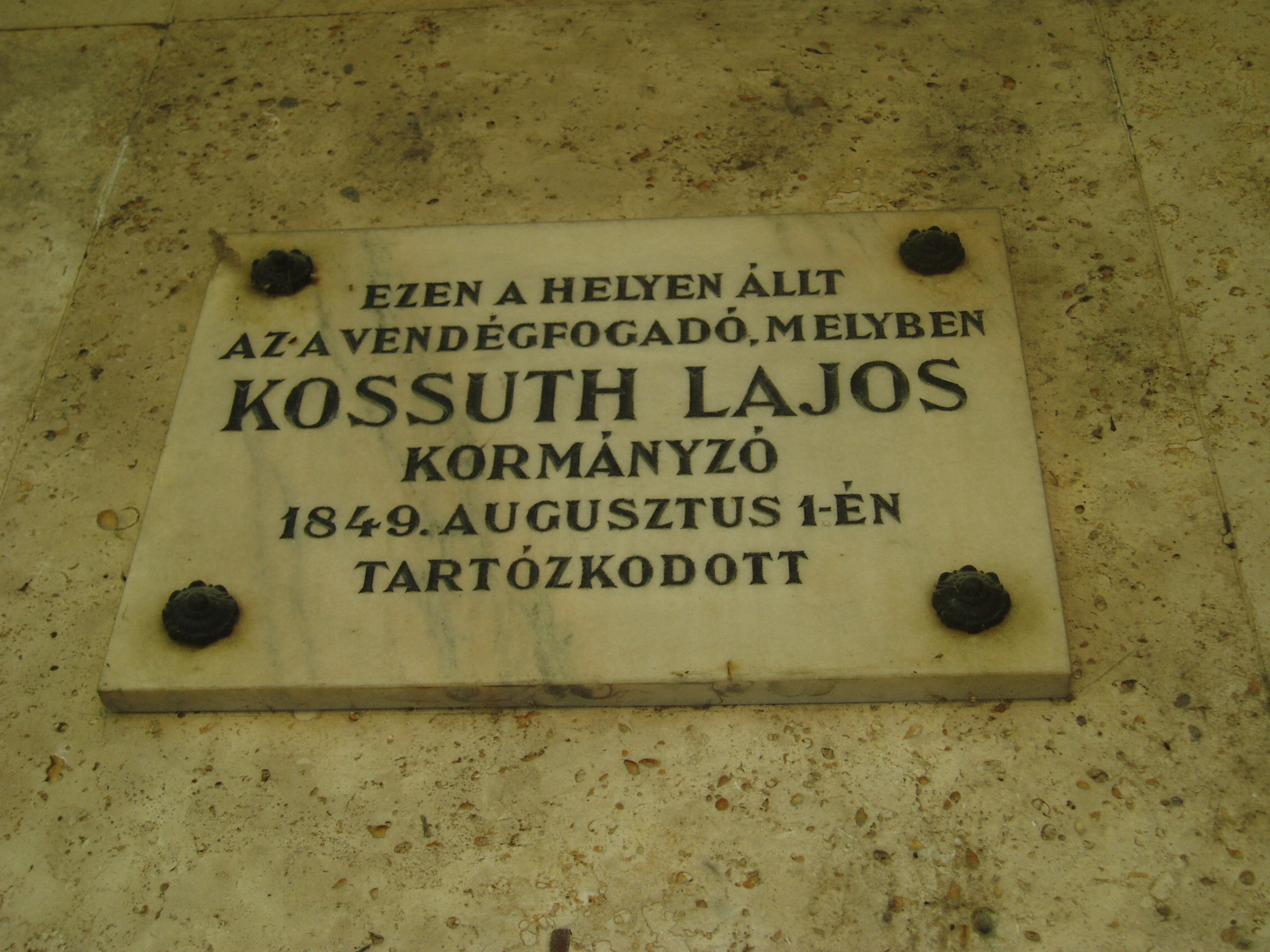 Nyilvános 1134 | 1488 | Makó, Széchenyi tér 15. | A Széchenyi teret déli oldalról az 1970-ben épült ún. csipkeházsor határolja, földszintjén üzletekkel. Rajta feliratos tábla idézi Kossuth Lajos emlékét, aki 1849. augusztus 1-jén a jelenlegi ház helyén álló hajdani fogadó vendége volt. A fénykép 2007 júliusában készült. Felh. irod.: Barangolások Csongrád megyében. Miskolc, Well-PRess, 1997 |