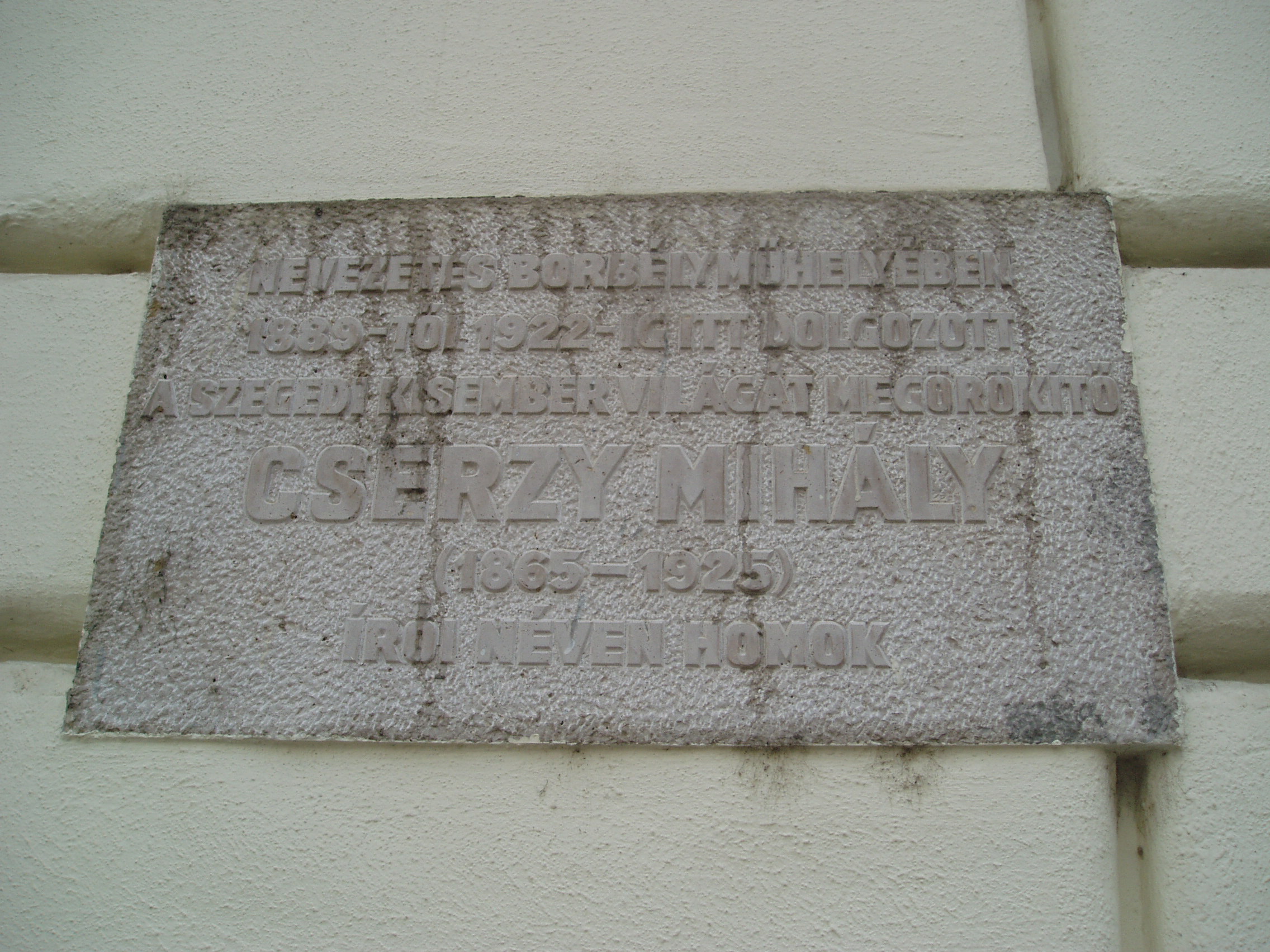 Nyilvános 1128 | 1567 | Szeged, Klauzál tér 1. Az új Zsótér-ház | A városi palota Kelemen László utcai oldalán volt Cserzy Mihály, a Homok álnéven publikáló országosan ismert író borbélyműhelye. Nemcsak a szegedi tanyák népének volt érzelmes hangú krónikása, hanem a városi szegénység életének is rokonszenvező, humanista ábrázolója. 1966 óta emléktábla hirdeti, hogy az írónak, aki hajlott koráig kitartott apjának mestersége, a fodrászat mellett, 1889-től 1922-ig itt volt a műhelye. A fénykép 2007 júliusában készült. Felh. irod.: Péter László: Szeged. Bp. Panoráma, 1981 |