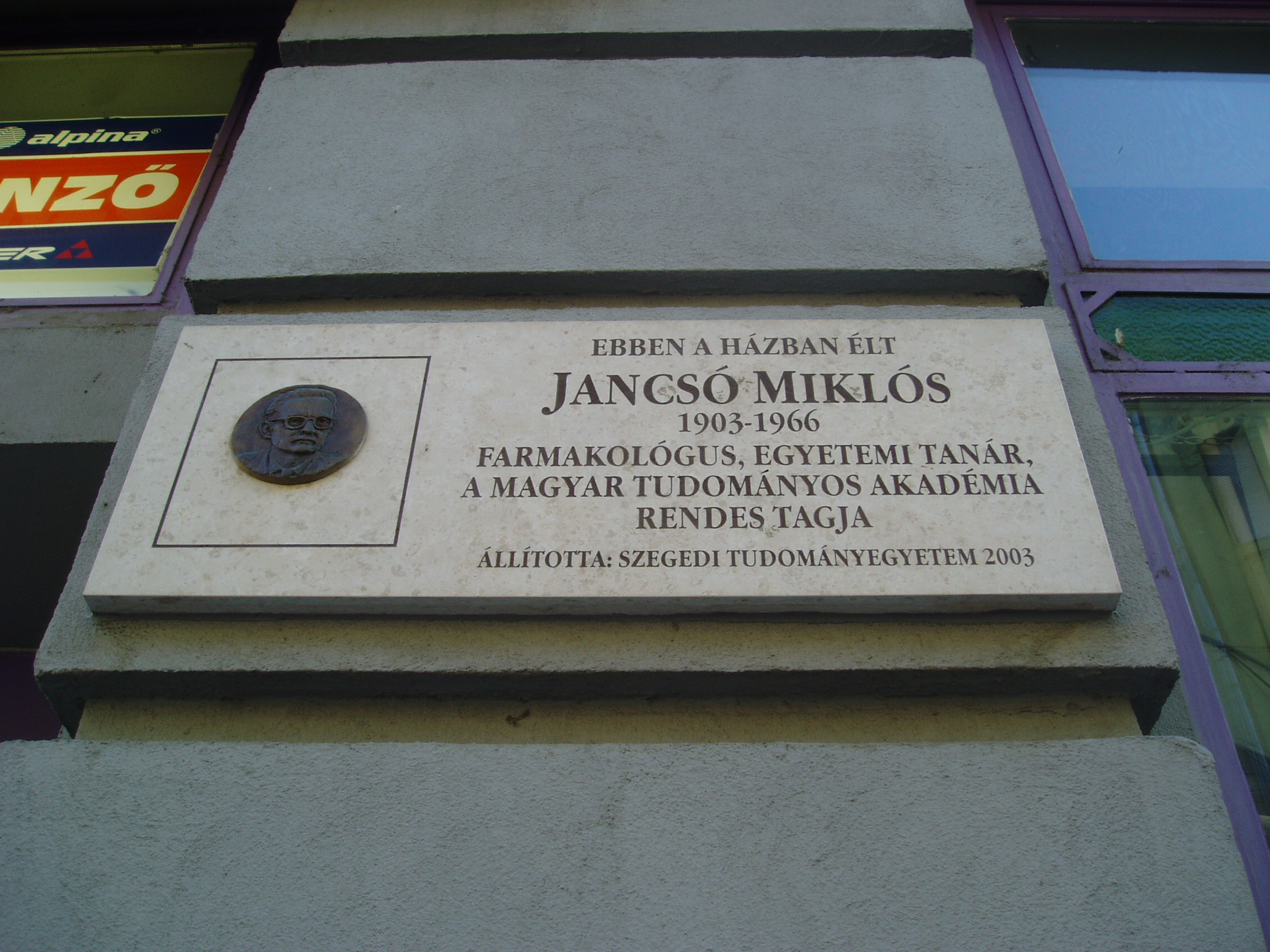 Nyilvános 1125 | 1547 | Szeged, Kölcsey utca 10. | Mint az épületen elhelyezett emléktáblán is olvasható, ebben a házban élt Jancsó Miklós (1903-1966) farmakológus, egyetemi tanár, a Magyar Tudományos Akadémia rendes tagja. Ugyancsak itt volt Vántus István (1935-1992) zeneszerző otthona 1982-től 1992-ben bekövetkezett haláláig. Az ő emléktábláját 1993-ban állították. A fénykép 2007 júliusában készült. Felh. irod.: Tizenkét év kőben és ércben. Szerk. Kerek Attila. Szeged, [2002] |