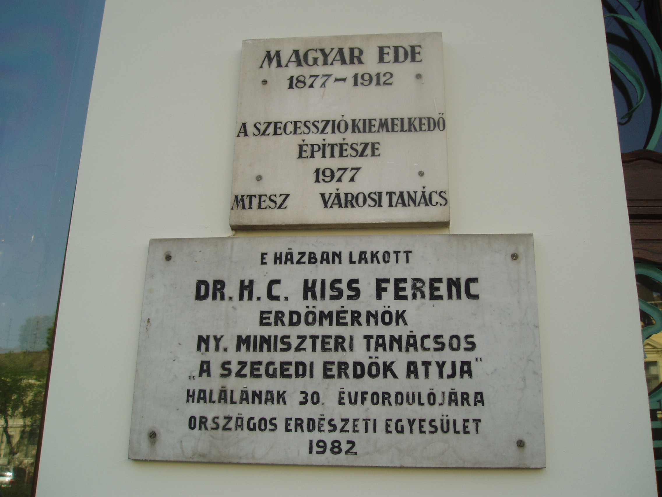 Nyilvános 1192 | 1563 | Szeged, Tisza Lajos körút 56. Reök-palota | A Reök-palota 1907-ben épült szecessziós stílusban Magyar Ede (1878-1912) tervei szerint. Az annakidején lakóházként funkcionáló épület lakója volt Kiss Ferenc főerdőtanácsos. 1860-ban született a Sopron megyei Szilsárkányban, egyszerű parasztszülők nyolcadik gyermekeként. A selmecbányai Erdészeti Akadémián szerzett erdőmérnöki oklevelet, majd 1885-ben erdőtisztként Szegedre került, hogy felügyelje a város körüli, állami kezelésbe adott erdőket. Szívügye volt az Alföld homokterületeinek betelepítése, nem véletlenül nevezték "a szegedi erdők atyjának". A palotán Magyar Ede építész emléktábláját is elhelyezték. A fénykép 2007 júliusában készült. Felh. irod.: Péter László: Szeged. Bp. Panoráma, 1981 www.puszta.com/hun/programs/cikk/reok_palota_ujjaszuletese |