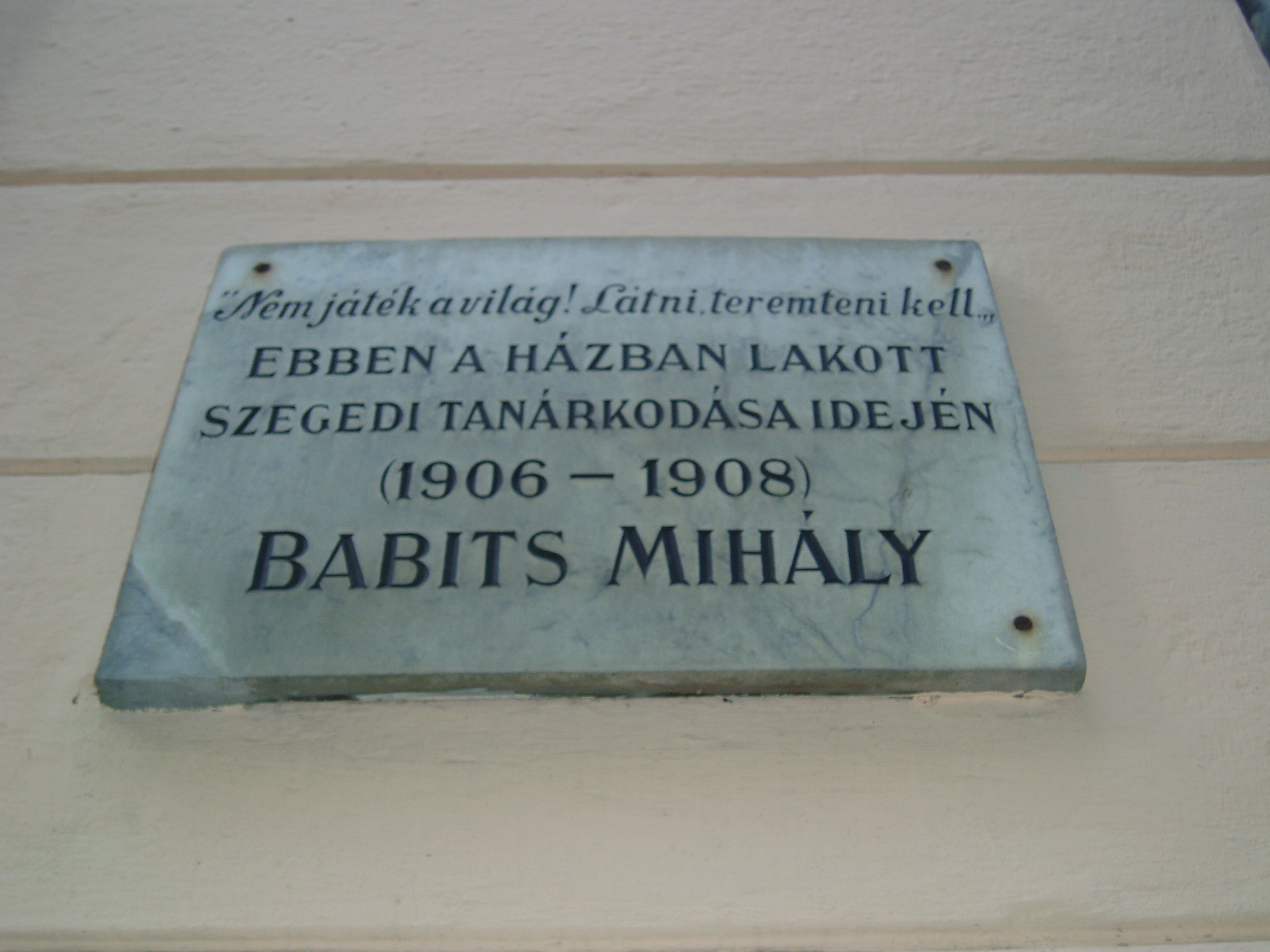 Nyilvános 1280 | 1883 | Szeged, Vitéz utca 16. | A Szentháromság utcát keresztező Vitéz utca 16. számú házán emléktábla olvasható: e házban lakott szegedi tanárkodása idején (lásd: Szeged, Horváth Mihály u. 2.), 1906 karácsonyától 1908 nyaráig Babits Mihály. 1956-ban, a tábla leleplezésekor jelen volt Szabó Lőrinc. Az emlékünnepségen ő idézte fel mesterének és barátjának alakját. Babits alkotói csöndet talált ebben a házban. A költőtárs Juhász Gyula, aki többször járt itt nála, 1924-ben megjelent "Babits Szegeden" című írásában így emlékezett: "Életét megosztotta az iskola és az irodalom között; volt idő, amikor csak az éjszaka óráit szakíthatta a költészetnek ... Megesett, hogy késő reggel benyitottam hozzá, és még mindig olvasmányába elmerülten találtam. Lámpája égett, pedig a nap már régen besütött az ablakán." Itt írta Babits a "Levelek Írisz koszorújából" című kötetének számos versét és itt érlelődött benne Dante-fordítása is. A fénykép 2007 júliusában készült. Felh. irod.: Péter László: Szeged. Bp. Panoráma, 1981 |