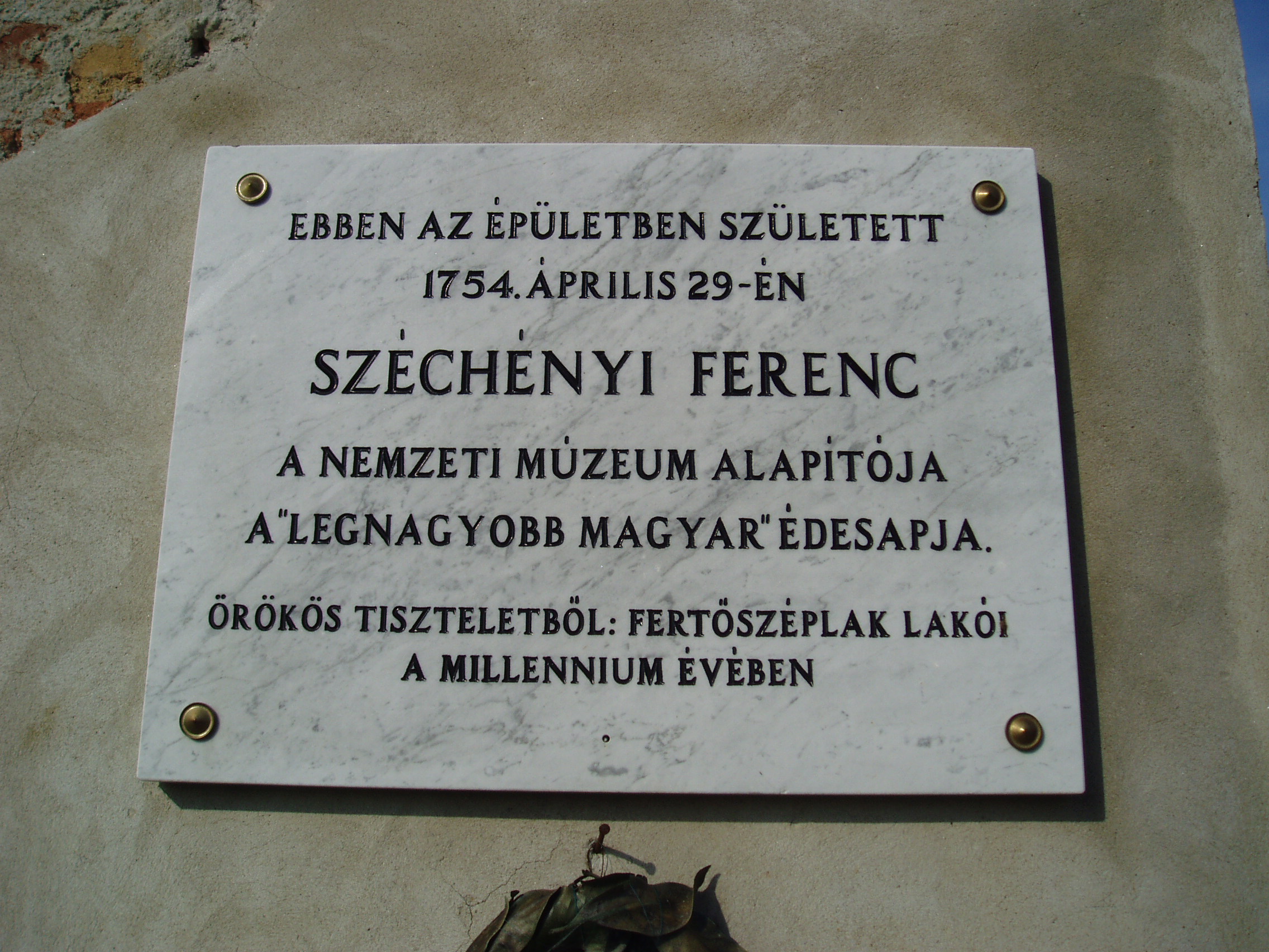 Nyilvános 1330 | 2031 | Fertőszéplak, Hősök tere 1. | Az egykori Széchényi-kastély ma elhanyagolt állapotú. Kapuja félköríves, oldalt toszkán félpillérekkel. Az udvari belső falon olvasható a Széchényiek jeligéje: "Deus me regit, nihil me deerit" (Isten velem van, baj nem érhet). A kastélyban született Széchényi Ferenc, a Nemzeti Múzeum és Könyvtár alapítója, Széchenyi István édesapja. Felh. irod.: www.vendegvaro.hu Látnivalók Győr-Moson-Sopron megyében. Miskolc, Well-PRess, 2000 |