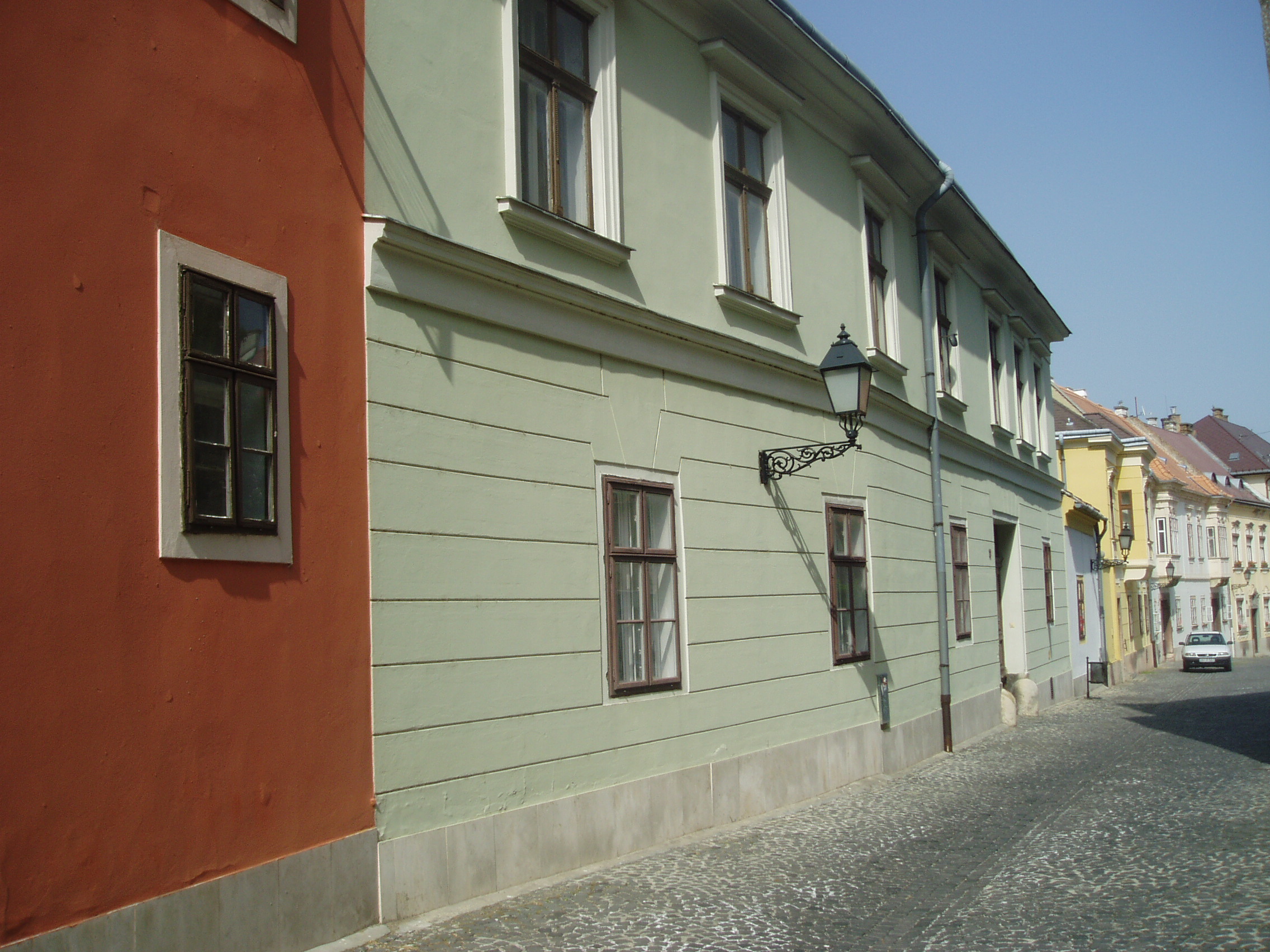 Nyilvános 1153 | 2064 | Győr, Káptalandomb 11. | A székesegyház apszisától kelet felé sétálva, a dombtetőről levezető út mentén találjuk a Káptalandomb legértékesebb műemlékházait. A 11. számú egyemeletes, klasszicista stílusú épület, mai homlokzata az 1800-as évek elején készült. A felvétel 2008 május végén készült. Felh. irod.: Cziglényi László: Győr. Bp. Panoráma, 1981 |