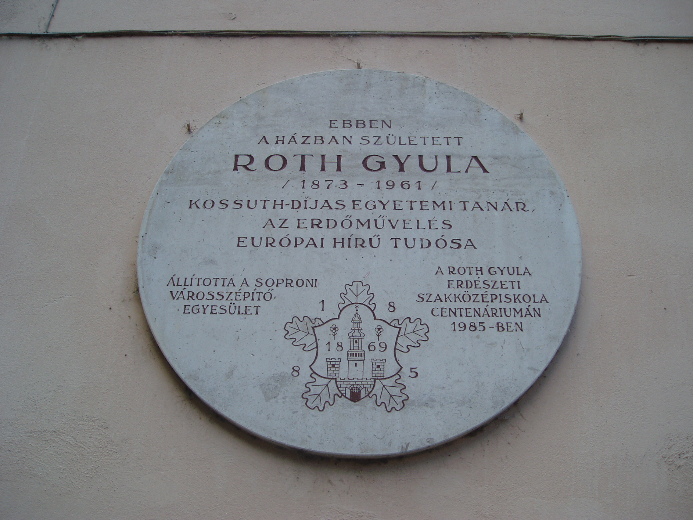 Nyilvános 1172 | 1658 | Sopron, Előkapu 3. | Sopron belvárosának főbejárata az északon nyíló Előkapu. Helye már a római korban lakott volt, majd a középkorban erődítésrendszert alakítottak itt ki. A területet a XVIII. század közepétől kezdték beépíteni lakóházakkal. A homlokzaton elhelyezett emléktábla tanúsága szerint a 3. szám alatt született Roth Gyula (1873-1961) Kossuth-díjas egyetemi tanár, az erdőművelés európai hírű tudósa. A fénykép 2008 júniusában készült. Felh. irod.: Czellár Katalin: Sopron. 3. jav. kiad. Bp. Panoráma, 2000 |