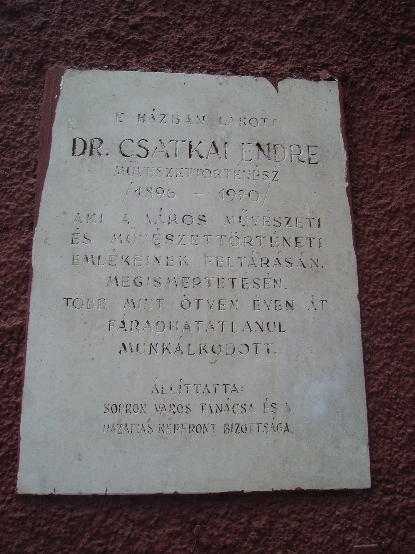 Nyilvános 1172 | 1676 | Sopron, Előkapu 10. | Sopron belvárosának főbejárata az északon nyíló Előkapu. Helye már a római korban lakott volt, majd a középkorban erődítésrendszert alakítottak itt ki. A területet a XVIII. század közepétől kezdték beépíteni lakóházakkal. Az itt álló, fűrészfogasan kialakított lakóépületek az egykori erődítés vonalát követik. Mint emléktáblája is tanúsítja, ebben a házban élt Csatkai Endre (1896-1970) művészettörténész, aki Sopron művészeti és művészettörténeti emlékeinek feltárásán, megismertetésén több, mint ötven éven át munkálkodott. Neve és munkássága megkerülhetetlen a Sopronnal ismerkedőknek. A fénykép 2008 júniusában készült. Felh. irod.: Czellár Katalin: Sopron. 3. jav. kiad. Bp. Panoráma, 2000 |