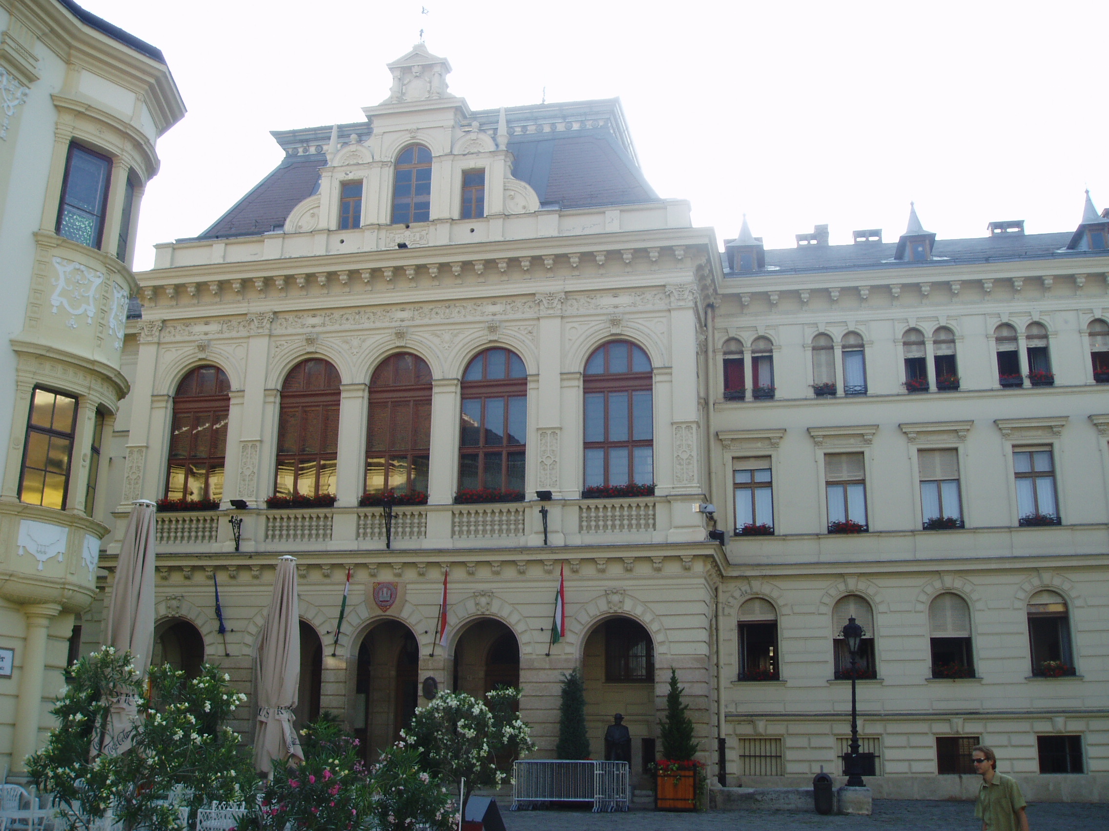 Nyilvános 1132 | 1524 | Sopron, Fő tér 1. Városháza | 1497-től állt ezen a helyen Sopron első számú középülete. Ekkor vásárolta meg és alakíttatta át a város az akkori régi házat. Itt működött a sokoldalú Lackner Kristóf polgármester, aki jeles művészként az épületet kívül és belül festményekkel, feliratokkal díszítette. A mai, eklektikus stílusú városháza az 1890-es évek első felében épült a régi, rossz állapotú középület helyére. Tervezői Hintraeger Mór és fia voltak. A kép 2008 júniusában készült. Felh. irod.: Czellár Katalin: Sopron. 3. jav. kiad. Bp. Panoráma, 2000 |