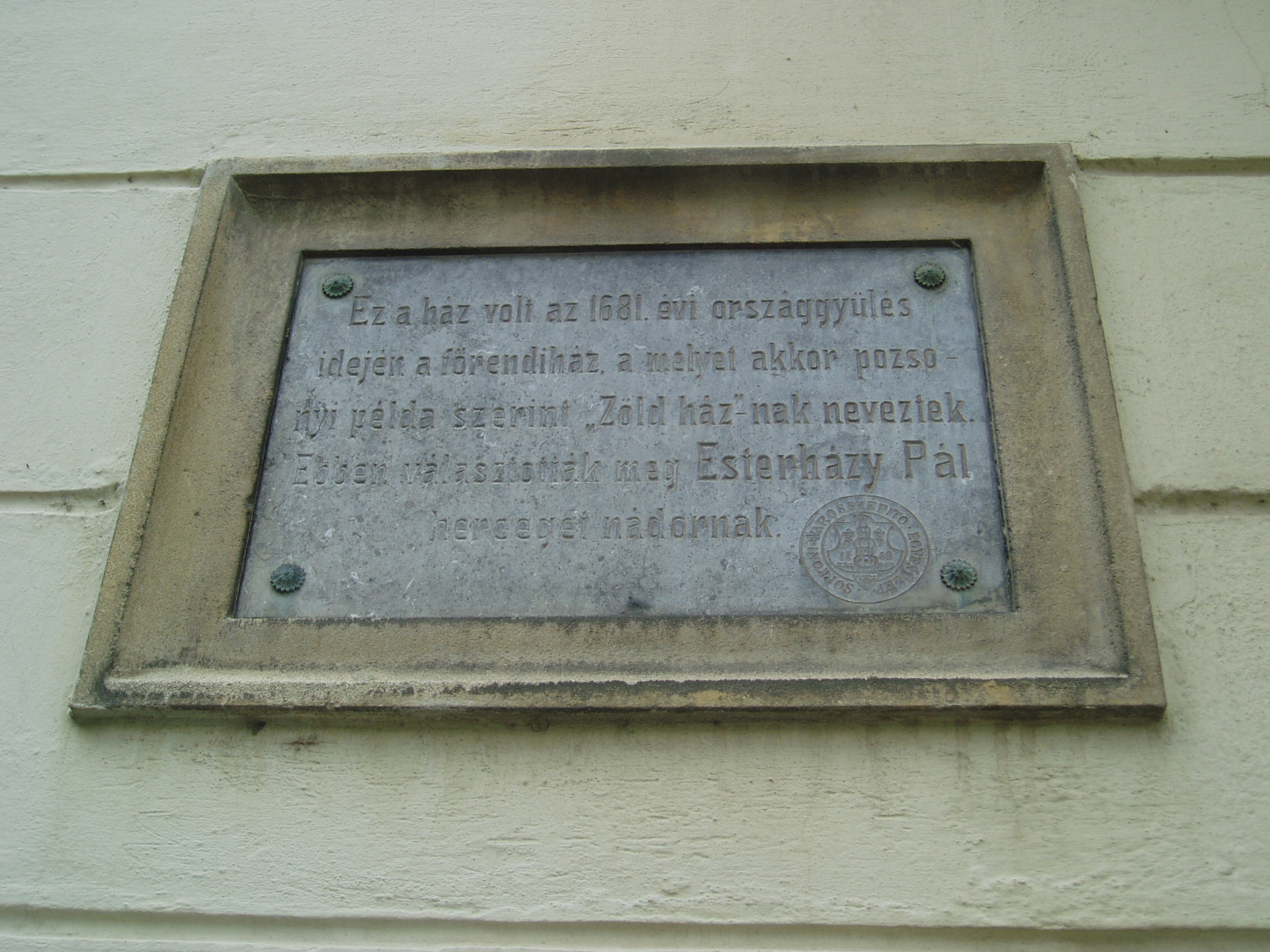 Nyilvános 1091 | 1433 | Sopron, Hátsókapu 2. | Az ún. Caesar–ház hatalmas reneszánsz sarokerkélyével a városkép jellegzetes eleme. Helyén valamikor több kisebb, valószínűleg a XV. században épült lakóház állt. Az 1676-ban Sopron belvárosát sújtó nagy tűzvész után ezek megmaradt részei, valamint a belső városfal maradványainak felhasználásával épült fel e pompás kis városi palota. Dongaboltozatos kapualjában megmaradtak a középkori ülőfülkék. Udvari szárnyának emeletén toszkán oszlopos, köríves árkádsor van. Az udvarból a falszorosban kialakított kertbe juthatunk, ahol látható a római és a ráépült középkori városfal, amelyet ablakokkal áttörve az épület hátsó homlokzataként használtak fel. Két emeleti termében megmaradt az 1700 körül készült, kora barokk ornamentális stukkómennyezet. Az 1681-es országgyűlés idején ebben az épületben ülésezett a főrendiház, ekkor választották Magyarország nádorává Esterházy Pál herceget, aki Harmonia caelestis című kantátasorozatával beírta nevét a magyar zenetörténetbe is. Az eseményt a Soproni Városszépítő Egyesület körpecsétjével ellátott emléktábla örökíti meg az épület homlokzatán. A fénykép 2008 júniusában készült. Felh. irod.: Czellár Katalin: Sopron. 3. jav. kiad. Bp. Panoráma, 2000 |