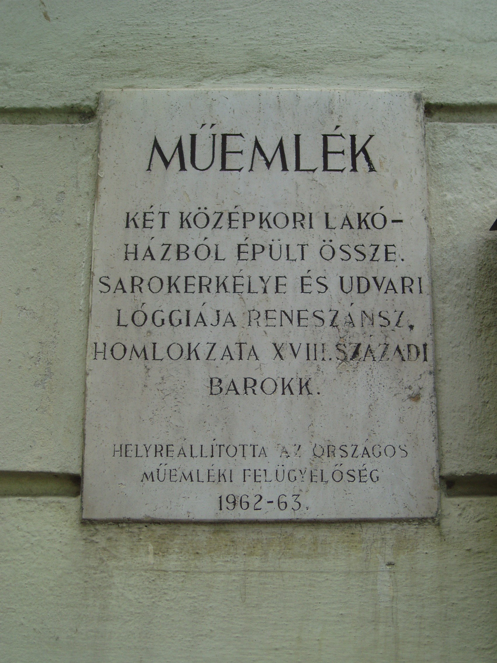 Nyilvános 1069 | 1407 | Sopron, Hátsókapu 2. | Az ún. Caesar–ház hatalmas reneszánsz sarokerkélyével a városkép jellegzetes eleme. Helyén valamikor több kisebb, valószínűleg a XV. században épült lakóház állt. Az 1676-ban Sopron belvárosát sújtó nagy tűzvész után ezek megmaradt részei, valamint a belső városfal maradványainak felhasználásával épült fel e pompás kis városi palota. Dongaboltozatos kapualjában megmaradtak a középkori ülőfülkék. Udvari szárnyának emeletén toszkán oszlopos, köríves árkádsor van. Az udvarból a falszorosban kialakított kertbe juthatunk, ahol látható a római és a ráépült középkori városfal, amelyet ablakokkal áttörve az épület hátsó homlokzataként használtak fel. Két emeleti termében megmaradt az 1700 körül készült, kora barokk ornamentális stukkómennyezet. Az 1681-es országgyűlés idején ebben az épületben ülésezett a főrendiház, ekkor választották Magyarország nádorává Esterházy Pál herceget, aki Harmonia caelestis című kantátasorozatával beírta nevét a magyar zenetörténetbe is. Az eseményt a Soproni Városszépítő Egyesület körpecsétjével ellátott emléktábla örökíti meg az épület homlokzatán. A fénykép 2008 júniusában készült. Felh. irod.: Czellár Katalin: Sopron. 3. jav. kiad. Bp. Panoráma, 2000 |