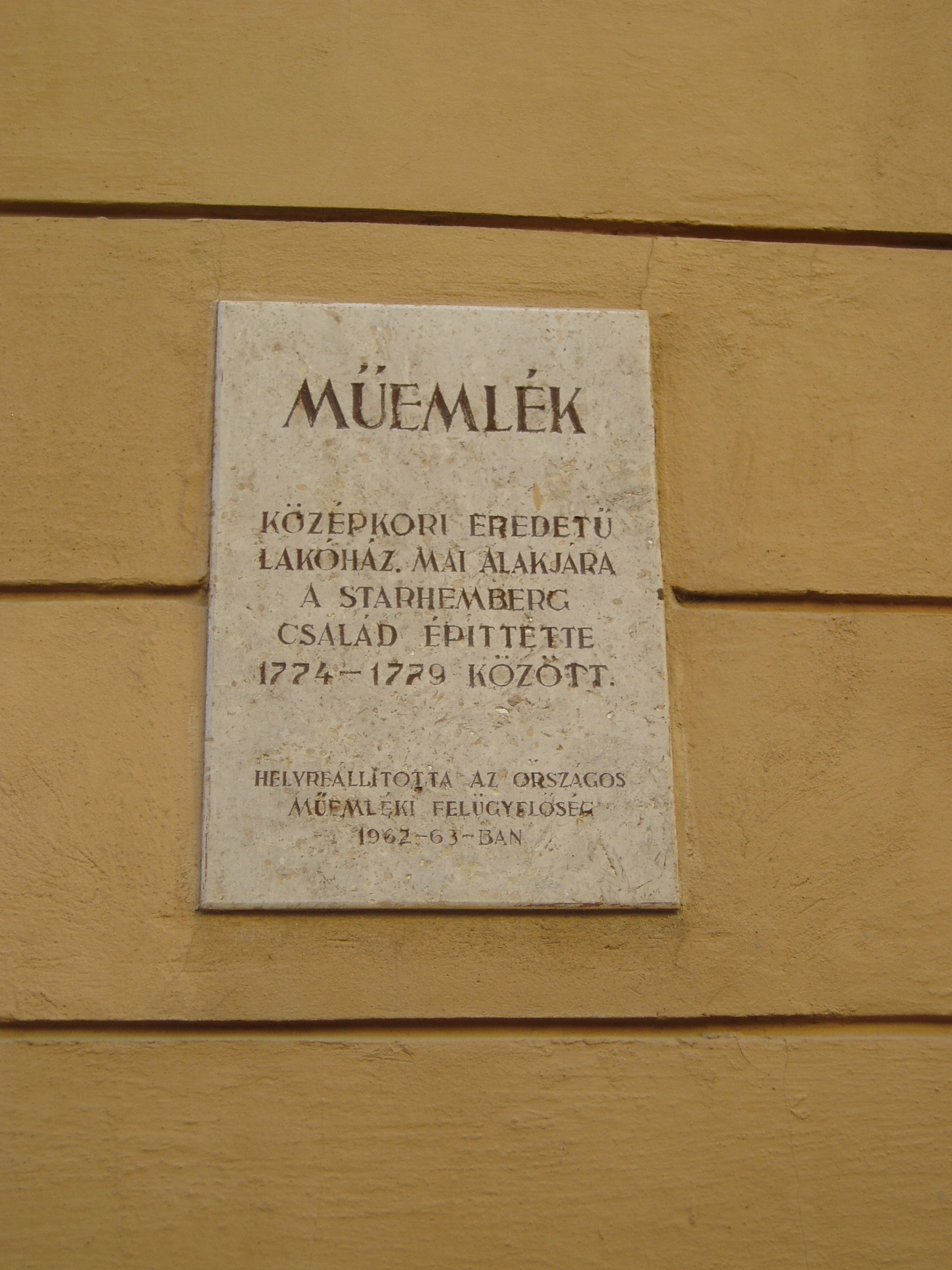 Nyilvános 1110 | 1559 | Sopron, Kolostor utca 3. | A kétemeletes, középkori eredetű barokk lakóház mai alakját az 1770-es években kapta, amikor Starhemberg Antal, magas rangú katonatiszt volt a tulajdonosa. Ekkoriban előkelő bálok helyszíne volt az épület. A fénykép 2008 júniusában készült. Felh. irod.: Czellár Katalin: Sopron. 3. jav. kiad. Bp. Panoráma, 2000 |