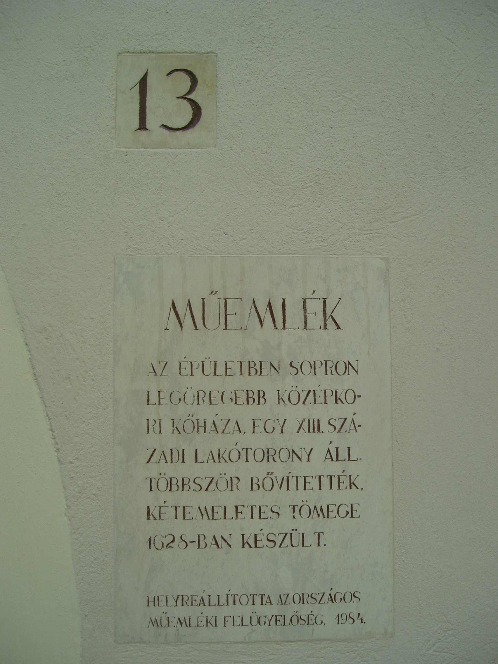 Nyilvános 1092 | 1494 | Sopron, Kolostor utca 13. | A lakóház Sopron eddig ismert legkorábbi világi kőépületének fennmaradt részeit őrzi: egy XIII. századi lakótornyot. A középkorban a mai Kolostor utca 13. és az Új utca 16. egy telek volt, s amikor a lakótornyos beépítést a harántházas váltotta fel, jómódú tulajdonosa a telek végében reprezentatív termet készíttetett. Ennek három szép gótikus ablakát az Új utca 16. számú épületen láthatjuk. 1628-ban az épületet kibővítették, majd kétemeletes formában épült újjá. Homlokzata egyszerű, követi az utca vonalát. A lakótoronyból megmaradt az alsó szint, a későromán keresztboltozat maradványa s egy alacsony emeleti ajtó. A mai épület kis udvarán festői szabad lépcső visz az emeletre, ahol egy toszkán oszlopos, pilléres, keresztboltozatú loggia van, fölötte zárt erkéllyel. A fénykép 2008 júniusában készült. Felh. irod.: Czellár Katalin: Sopron. 3. jav. kiad. Bp. Panoráma, 2000 |