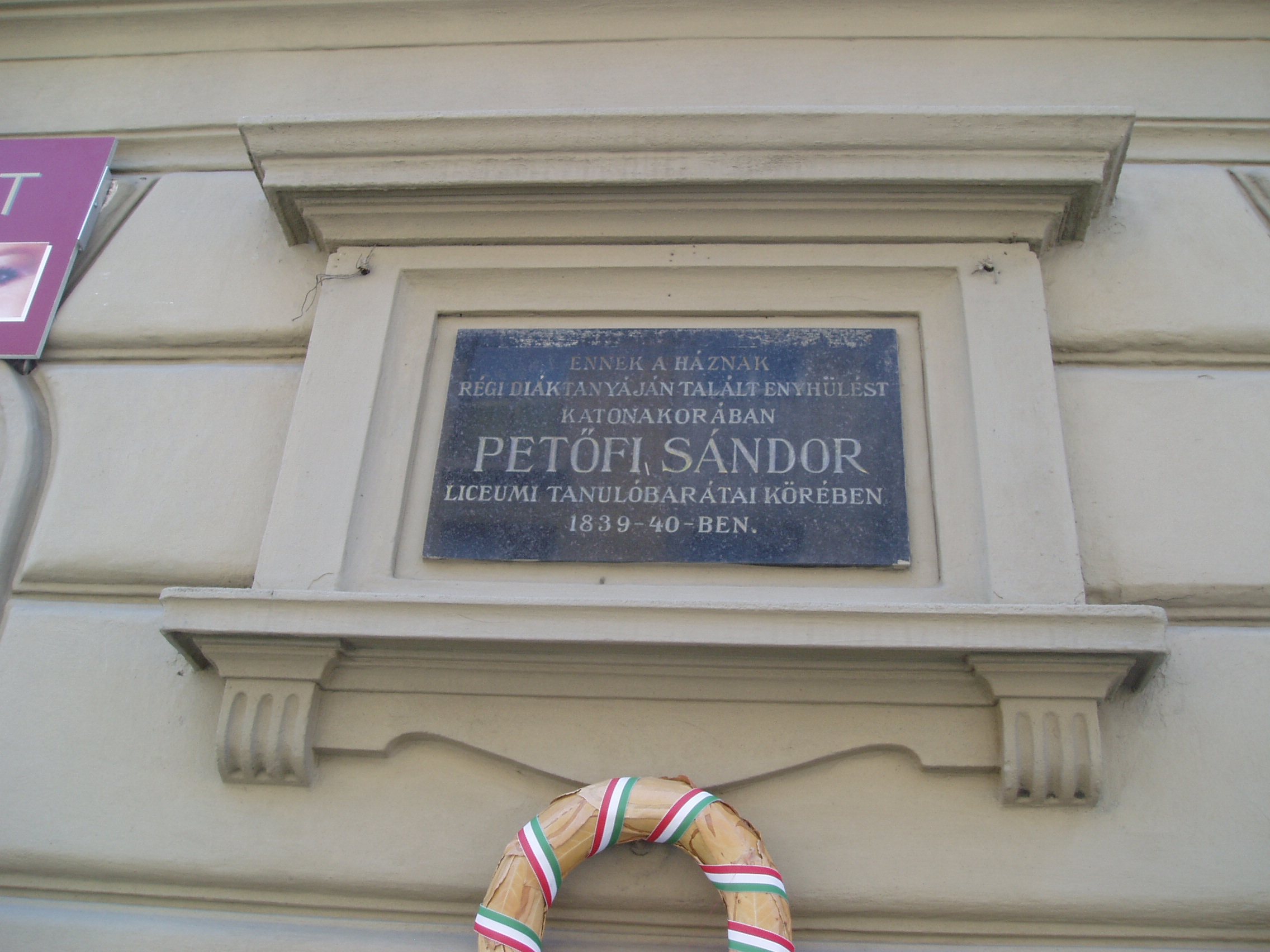 Nyilvános 1129 | 1571 | Sopron, Rákóczi utca 9. | Az épület homlokzatán elhelyezett emléktábla tanúsága szerint ennek a háznak régi diáktanyáján többször járt baráti társaságban soproni katonaidejének nehéz korszakában Petőfi Sándor 1939/40-ben. A kép 2008 júniusában készült. |