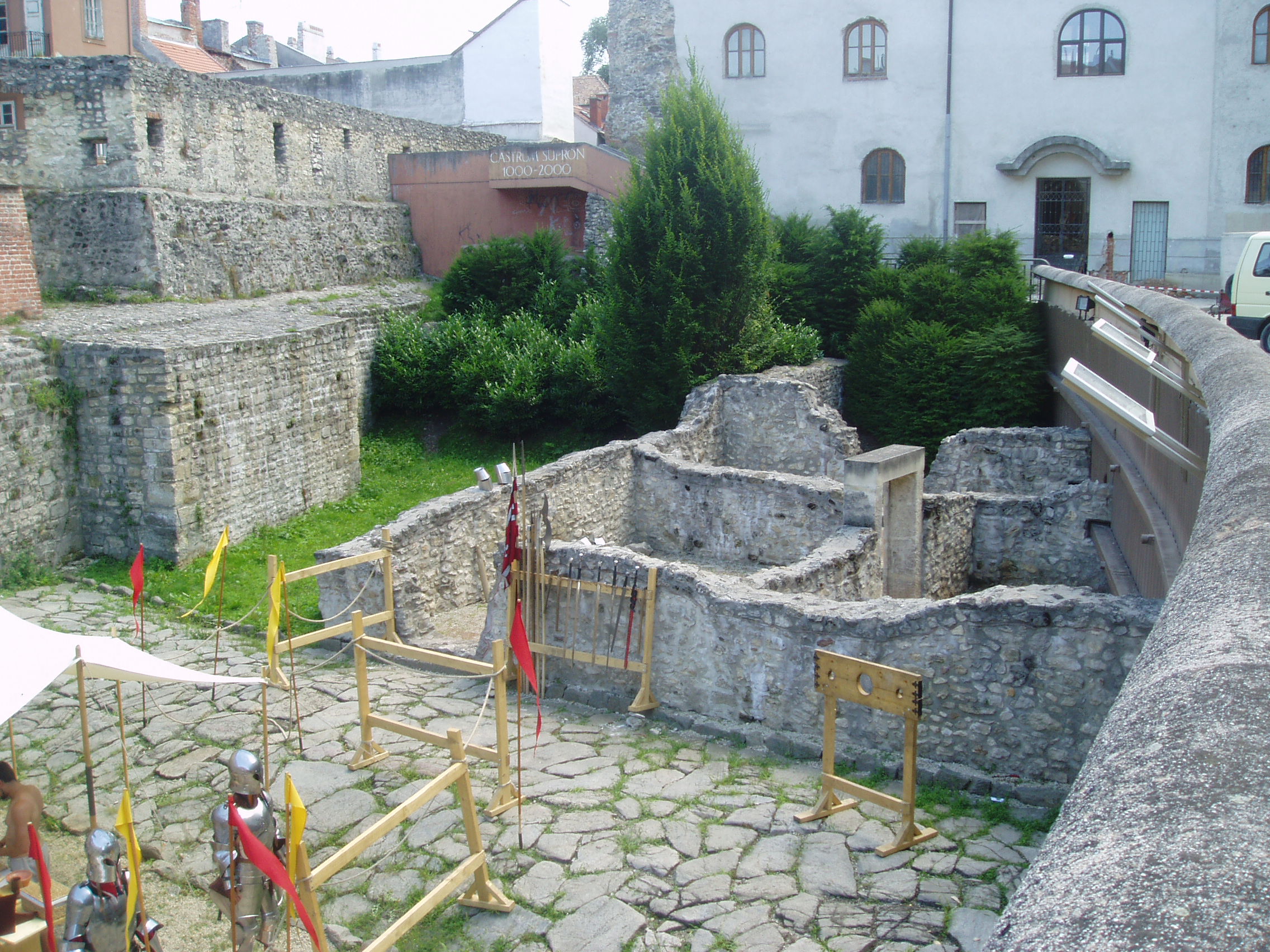 Nyilvános 1103 | 2278 | Sopron, Scarbantia Régészeti Park | Az egykori Római Birodalom Pannónia provinciájának egyik határállomása Scarbantia, a mai Sopron volt. A római oppidum központjának, a fórumnak legfontosabb épületét - a capitoliumi templomot - 1893 telén a városháza építésekor találták meg. Az 1960- és 1970-es évek ásatásaival végül sikerült meghatározni a fórum teljes kiterjedését és elhelyezkedését. A mai belváros szívében feltárt maradványokat - kiegészítve a a XI. századi ispáni vár feltárt sáncával - nagyszabású szabadtéri régészeti kiállítás keretében, térképekkel, ismertetőszövegekkel kellően ellátva szemlélheti meg a városnéző. A kép 2008 júniusában készült. |