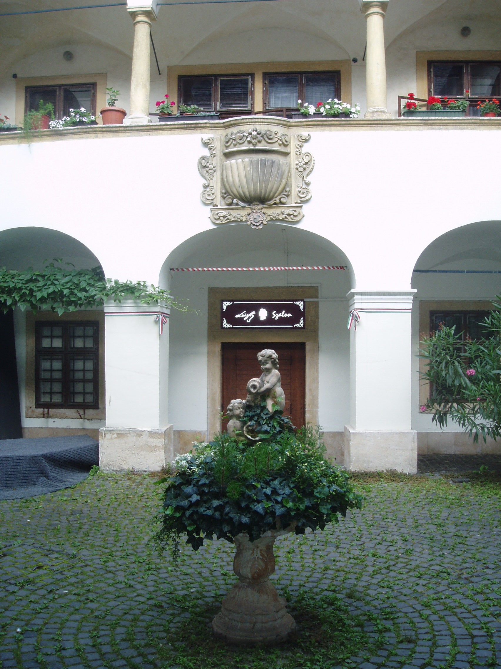 Nyilvános 1132 | 1499 | Sopron, Szent György utca 12. Eggenberg-ház | A XV. századi eredetű, 1674-ben bővített, barokk homlokzatú Eggenberg–ház kapuját a brandenburgi választófejedelem címere díszíti. Udvarán emeleti árkádsor fut körbe. A soproni evangélikusok történetében fontos szerepe volt egykori tulajdonosának, a brandenburgi őrgróf rokonának, Eggenberg hercegnének, aki 1674–76 között engedélyt kapott házában istentiszteletek tartására, ami a Lackner–ház (Fő tér 7.) kivételével tilos volt a városban. Ebből az időszakból maradt meg a kapuval szemközt az épület mellvédjébe épített faragott kő szószék. Alatta ajtó vezet a házban kialakított Liszt szalon helyiségeibe. A kávéházban kiállítás látható a budapesti Liszt Ferenc Emlékmúzeum (lásd: Budapest, VI. Vörösmarty u. 35.) anyagából a Sopronhoz több szállal kötődő Liszt Ferenc életútjáról. Lisztet és körét egy nagyméretű freskó is megidézi a szalon központi helyiségében. A kávéházban rendszeresen koncertekkel és gasztronómiai eseményekkel hódolnak a halhatatlan mester előtt. Az épület előtt járdába ágyazott kis bronztábla jelzi, hogy e hely a soproni Liszt Ferenc sétaút állomása. A közelmúltban jelölték ki azt a virtuális útvonalat, amely Liszt legfontosabb soproni emlékhelyeit köti össze, s melynek további pontjai a következők: Fő tér 8. (Storno–ház), Templom utca 6. (Bezerédj–ház), Petőfi tér 3. (a régi kaszinó), Széchenyi tér 15. (Liszt Ferenc Konferenciaközpont – az egykori új kaszinó, illetve ennek Templom utcai oldalánál álló Liszt–mellszobor). A kép 2008 júniusában készült. Felh. irod.: Czellár Katalin: Sopron. 3. jav. kiad. Bp. Panoráma, 2000 www.lisztfestival.hu |