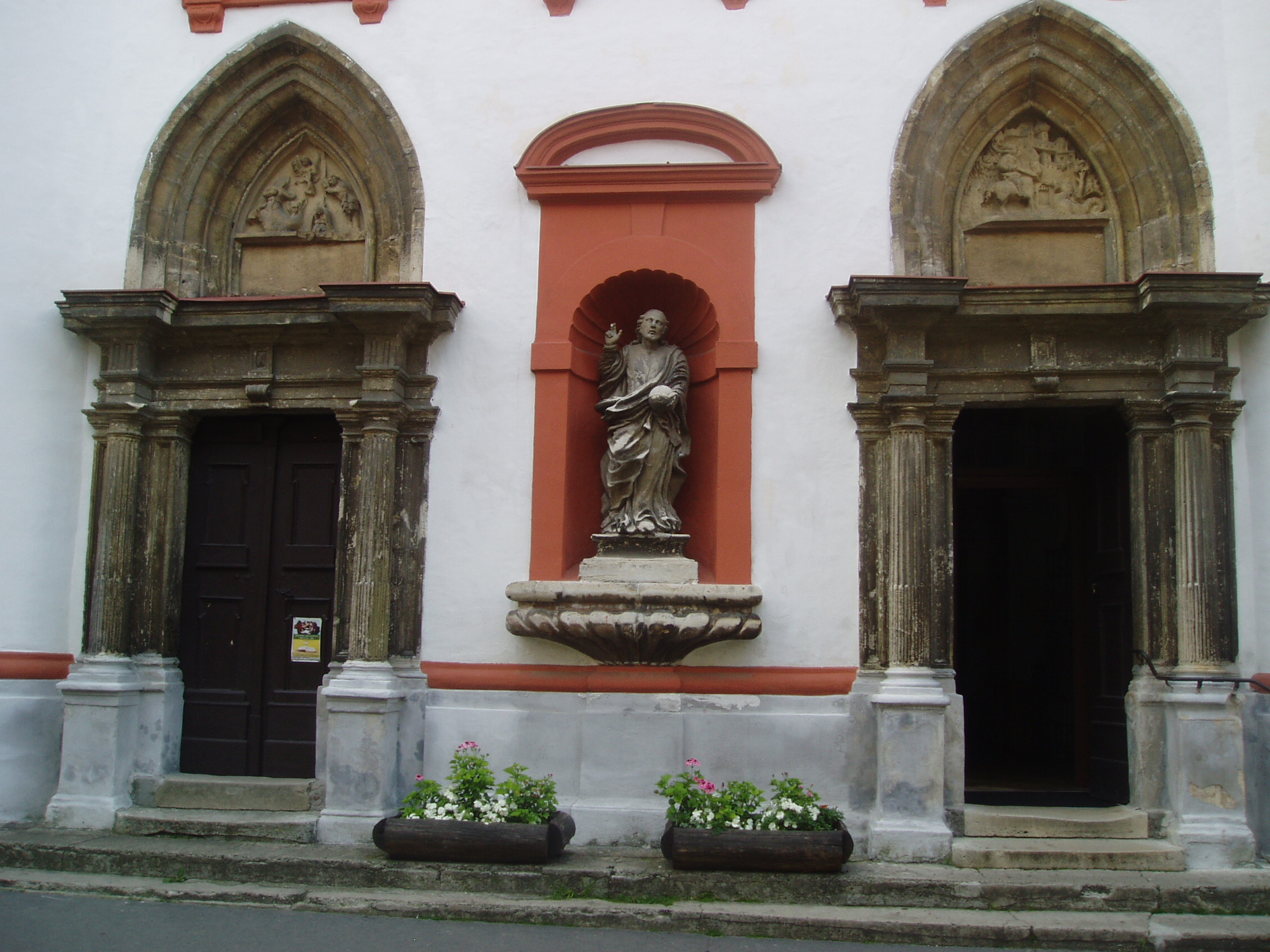 Nyilvános 1178 | 2495 | Sopron, Szent György utca 7. Szent György-templom | A Káptalan-házhoz azonos házszámmal csatlakozik a Szent György-templom. Az 1380–1430 között épült, eredetileg gótikus templom mozgalmas, olaszos homlokzata a XVII. századból származik, de rajta két gótikus dombormű máig megőrződött. Kisebb mértékben az 1760-as években is átalakították. Eklektikus tornya 1882-ben épült. Az egyhajós templomot az 1676-os tűzvész után több lépésben alakították át: a csúcsíves lezárású főhajót gazdag stukkóval díszítették, és két oldalán kápolnasorral keretezték. A szentély melletti keresztelőkápolnában középkori freskótöredéket látni. Az 1705–1706 között készült stukkódísz Pietro Antonio Conti műve, és berendezése is XVIII. századi. A kép 2008 júniusában készült. (A környék beépítettsége miatt csak ilyen felvételt tudtam róla készíteni: K.K.) Felh. irod.: Czellár Katalin: Sopron. 3. jav. kiad. Bp. Panoráma, 2000 |