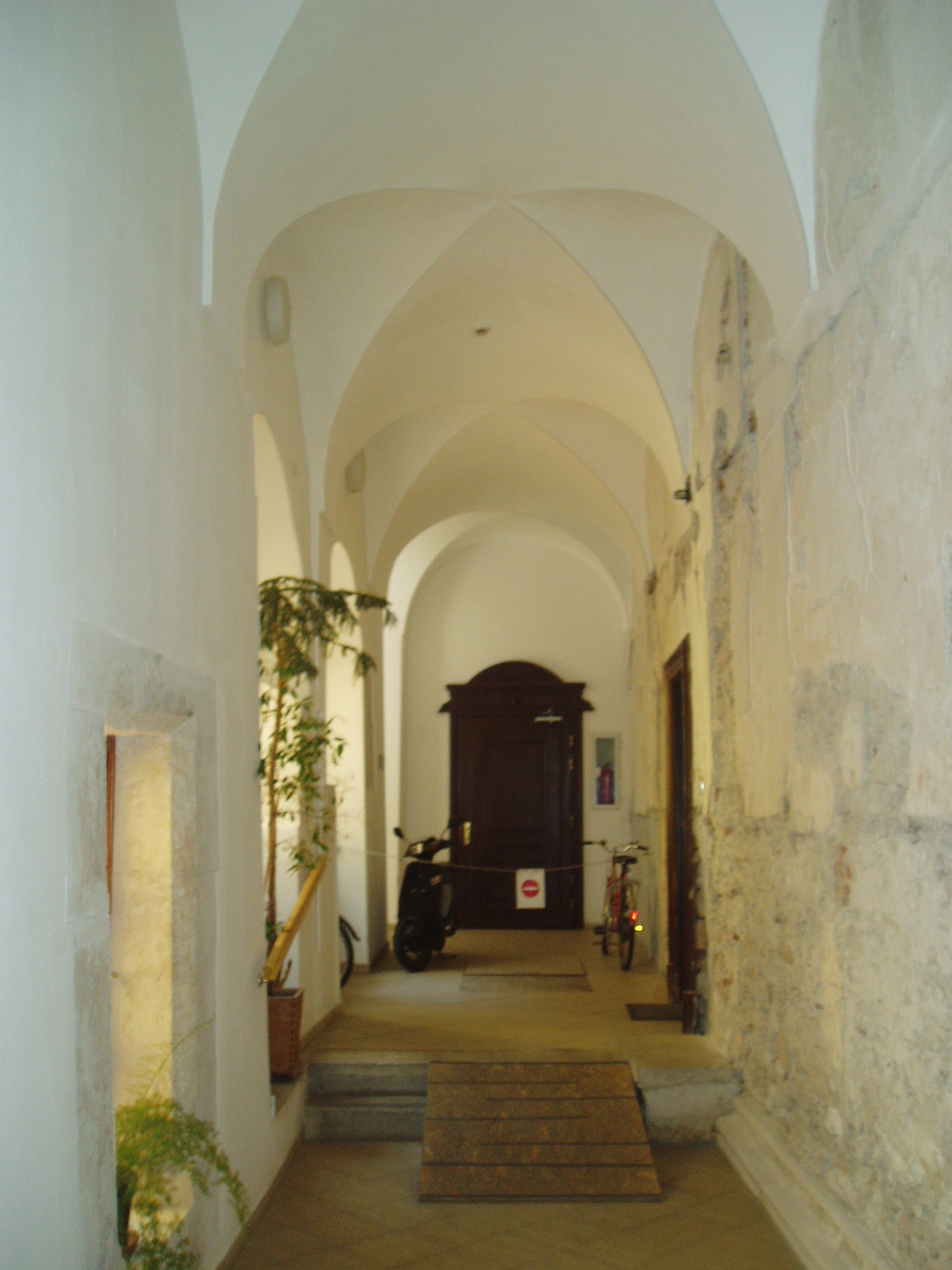 Nyilvános 1104 | 1457 | Sopron, Templom utca 1. | A Templom utca bal oldalán a Kecske–templomhoz (lásd: Sopron, Fő tér) kapcsolódik az egykori bencés rendház két udvart körülfogó, kétemeletes, nagytömegű, de igénytelen külsejű épülete. A templommal együtt a ferencesek számára épült, majd 1802-ben a bencések kapták meg. E hajdani kolostor tartozéka a látogatók számára a templomból megközelíthető Káptalan–terem, Sopron város egyik legszebb gótikus műemléke (lásd: Sopron, Fő tér. Kecske-templom, Káptalan terem). A képen a rendház folyosója látható. A kép 2008 júniusában készült. Felh. irod.: Czellár Katalin: Sopron. 3. jav. kiad. Bp. Panoráma, 2000 |