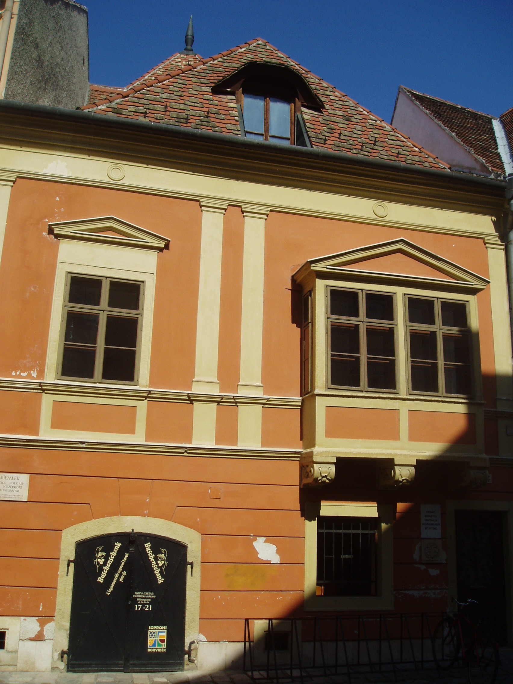 Nyilvános 1138 | 1452 | Sopron, Új utca 4. | Az egyemeletes lakóház középkori eredetű. Falai lakótorony maradványait rejtik. Zárt erkélye a XVII. századból származik, de homlokzatának többi részét a XIX. században átalakították. A kép 2008 júniusában készült. Felh. irod.: Czellár Katalin: Sopron. 3. jav. kiad. Bp. Panoráma, 2000 |