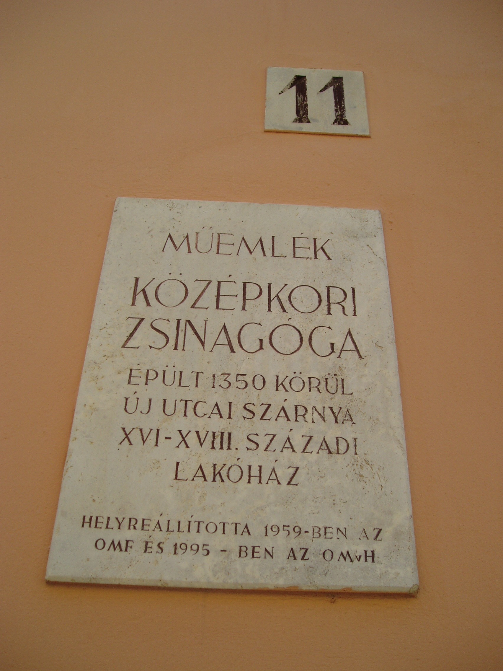 Nyilvános 1119 | 1422 | Sopron, Új utca 11. | A középkori eredetű lakóház középkori zsinagógát rejt. Az első zsidók a XIII. században települtek be Sopronba. 1370 körül épült ez az imaházuk, egy Izrael nevű bankár magánzsinagógájaként. A többször átalakított épület egyszerű barokk homlokzatának bal oldalán nyílik a kosáríves kapuzat, amelyen át beléphetünk a középkori templomba: elsőként egy utcára nyíló, boltozatos terembe, majd innét magába a zsinagógába. A két emelet magas termet kétszakaszos keresztboltozat fedi. A keleti falba mélyül az Áron-fülke, azaz a frigyszekrény. A kép 2008 júniusában készült. Felh. irod.: Czellár Katalin: Sopron. 3. jav. kiad. Bp. Panoráma, 2000 |