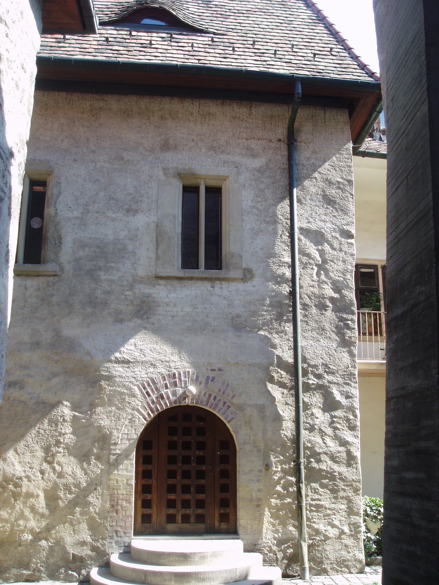 Nyilvános 1112 | 1426 | Sopron, Új utca 11. | A középkori eredetű lakóház középkori zsinagógát rejt. Az első zsidók a XIII. században települtek be Sopronba. 1370 körül épült ez az imaházuk, egy Izrael nevű bankár magánzsinagógájaként. A többször átalakított épület egyszerű barokk homlokzatának bal oldalán nyílik a kosáríves kapuzat, amelyen át beléphetünk a középkori templomba: elsőként egy utcára nyíló, boltozatos terembe, majd innét magába a zsinagógába. A képen a boltozatos terem bejárata látható. A kép 2008 júniusában készült. Felh. irod.: Czellár Katalin: Sopron. 3. jav. kiad. Bp. Panoráma, 2000 |