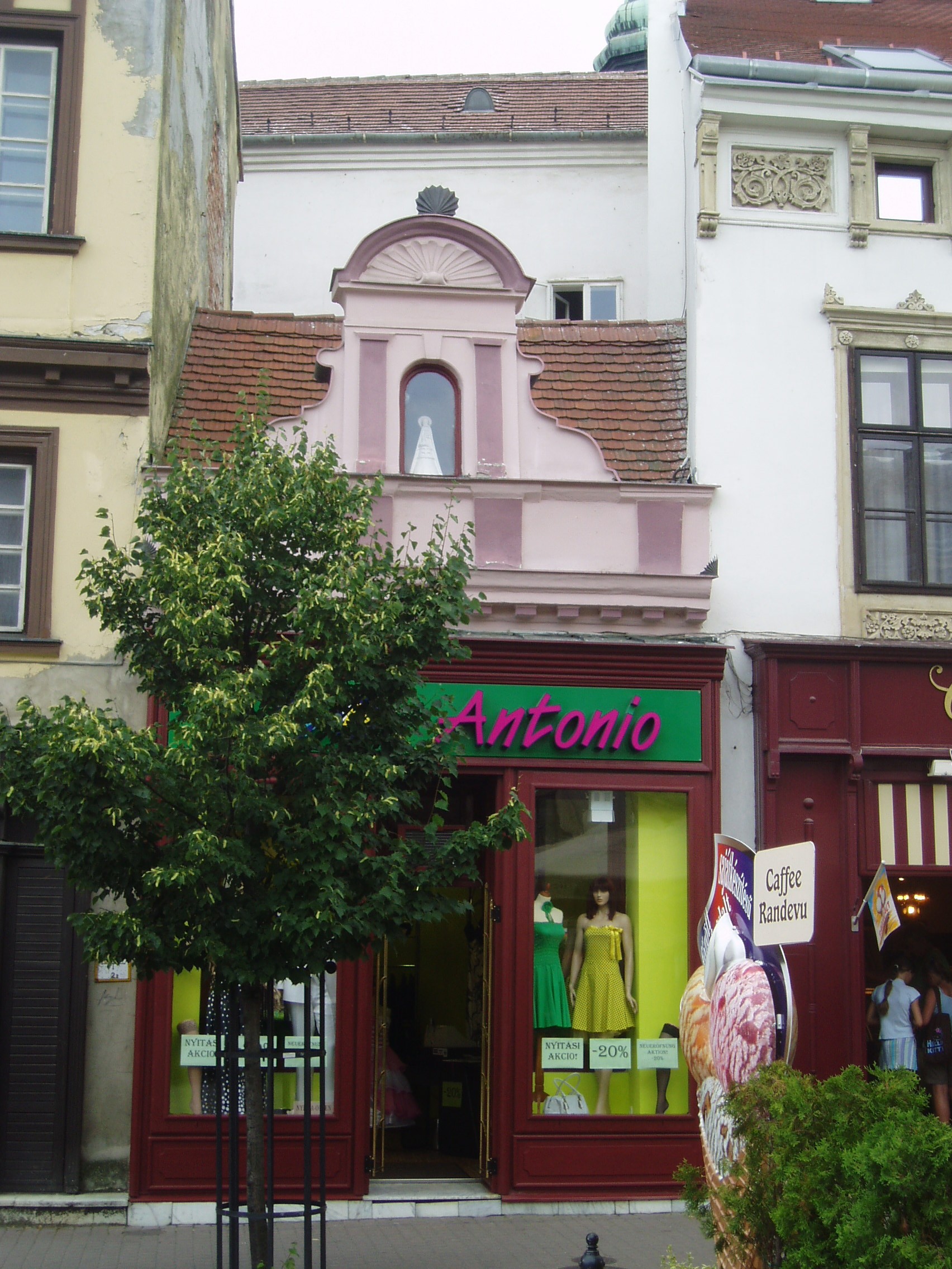 Nyilvános 1054 | 1582 | Sopron, Várkerület 42. | Sopron - és talán az egész ország - legkisebb üzletháza: alapterülete mindössze 1 négyszögöl. A kép 2008 júniusában készült. Felh. irod.: Czellár Katalin: Sopron. 3. jav. kiad. Bp. Panoráma, 2000 |