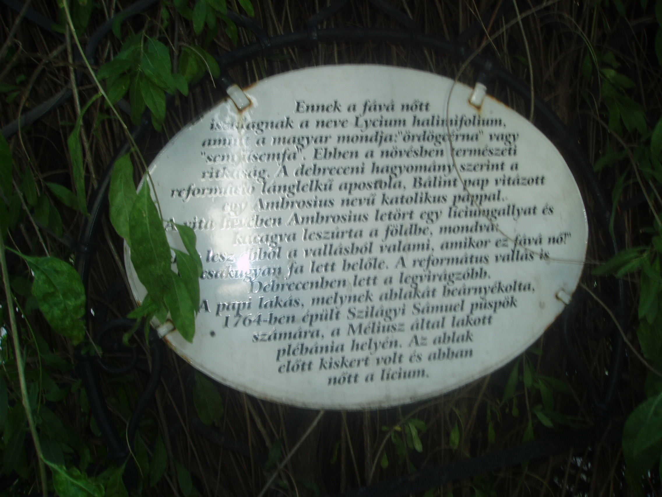 Nyilvános 1190 | 1692 | Debrecen, Hatvan utca 1. Líciumfa | A Nagytemplom háta mögött zöldellő Emlékkert nyugati oldalánál található a fává nőtt líciumtő (semfű-semfa, hivatalos nevén lycium halimofolium). A növény ebben az alakjában botanikai ritkaság, mert általában bokorként, cserjeként ismeretes. A líciumfához egy sokat emlegetett művelődéstörténeti anekdota fűződik (aminek a botanikusok szerint nincs valós alapja): A XVI. században Debrecen városának a reformáció útjára való áttérését megindító Bálint pap a katolikus Ambrosius mesterrel heves vitában sétált itt, az egykori öreg plébánia előtti úton. Kezében egy letört líciumágat tartott és azzal gesztikulált, hogy nagyobb nyomatékot adjon szavainak. Ambrosius mester makacsul hangoztatta, hogy sohasem lesz vallás abból, amit Kálvin tanít. "Akkor lesz ebből vallás - kiáltotta indulatosan -, mikor a lycium fává nő." "Hát akkor fa lesz belőle!" - válaszolta Bálint pap, és lábai előtt a földbe szúrta a líciumágat. S az igénytelen kis gallyacska megfogant s fává terebélyesedett, ágaival befonta a plébánia vasrácsos ablakrostélyát. Mikor évszázadok múlva sor került az öreg épület lebontására, a legendává nőtt líciumfát az ablakrostéllyal együtt érintetlenül hagyták, s ma is ebben az állapotában látható. A fénykép 2006 júniusában készült. Felh. irod.: Papp Antal: Debrecen. Bp. Panoráma, 1976 Kovács Gergelyné: Debrecen. Bp. Panoráma, 1981 |