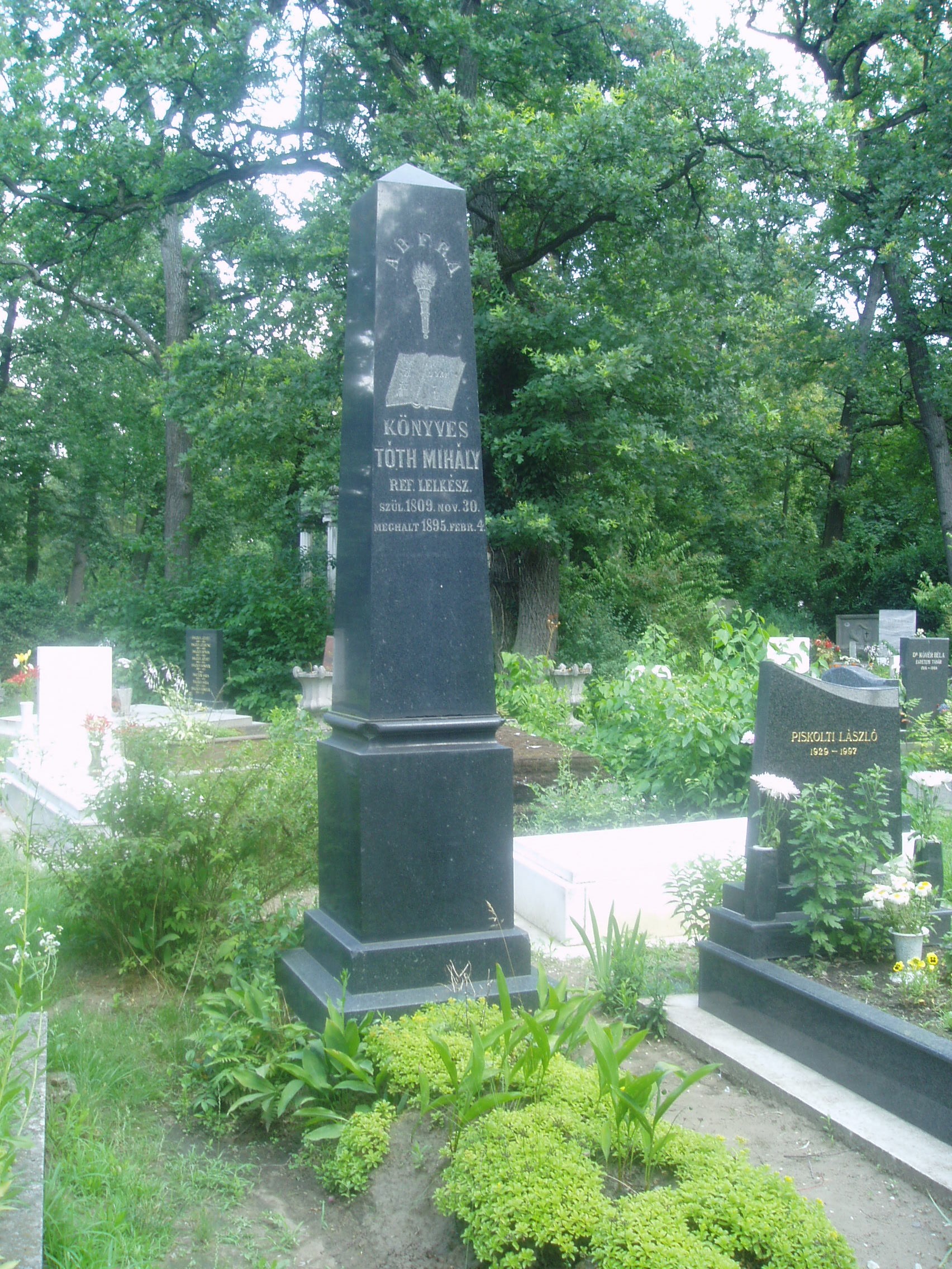 Nyilvános 1616 | 3984 | Debrecen, Bocskai út, Köztemető: Könyves Tóth Mihály sírja | Debrecen új köztemetőjét 1932-36 között alakították ki. A temetőkertet és a nagy művészettörténeti értéket képviselő ravatalozó épületét Borsos József tervezte. A díszsírhelyek a főbejárattól jobbra helyezkednek el. Itt nyugszik a magyar művelődástörténet számos nagy alakja, akiknek földi maradványait áthozták a többnyire felszámolt régi temetőkből. Itt nyugszik Könyves Tóth Mihály (Debrecen, 1809. nov. 30. – Debrecen, 1895. febr. 4.) református lelkész. 1836-tól debreceni prédikátor. A szabadságharc idején buzdító beszédeket mondott, sőt az aradi táborban is jelen volt. Ezért előbb halálra, majd húsz év várfogságra ítélték. 1856-ban kiszabadult, de hosszú ideig tilos volt lelkészi és tanítói állást elfoglalnia. 1863-tól Karcagon, 1871-től Debrecenben papként működött. Jó szónok volt, több prédikációja és halotti beszéde nyomtatásban is megjelent. (Lásd még: Debrecen, Széchenyi u. 4.) A fénykép 2006 júniusában készült. Felh. irod.: Kovács Gergelyné: Debrecen. Bp. Panoráma, 1981 Magyar életrajzi lexikon |