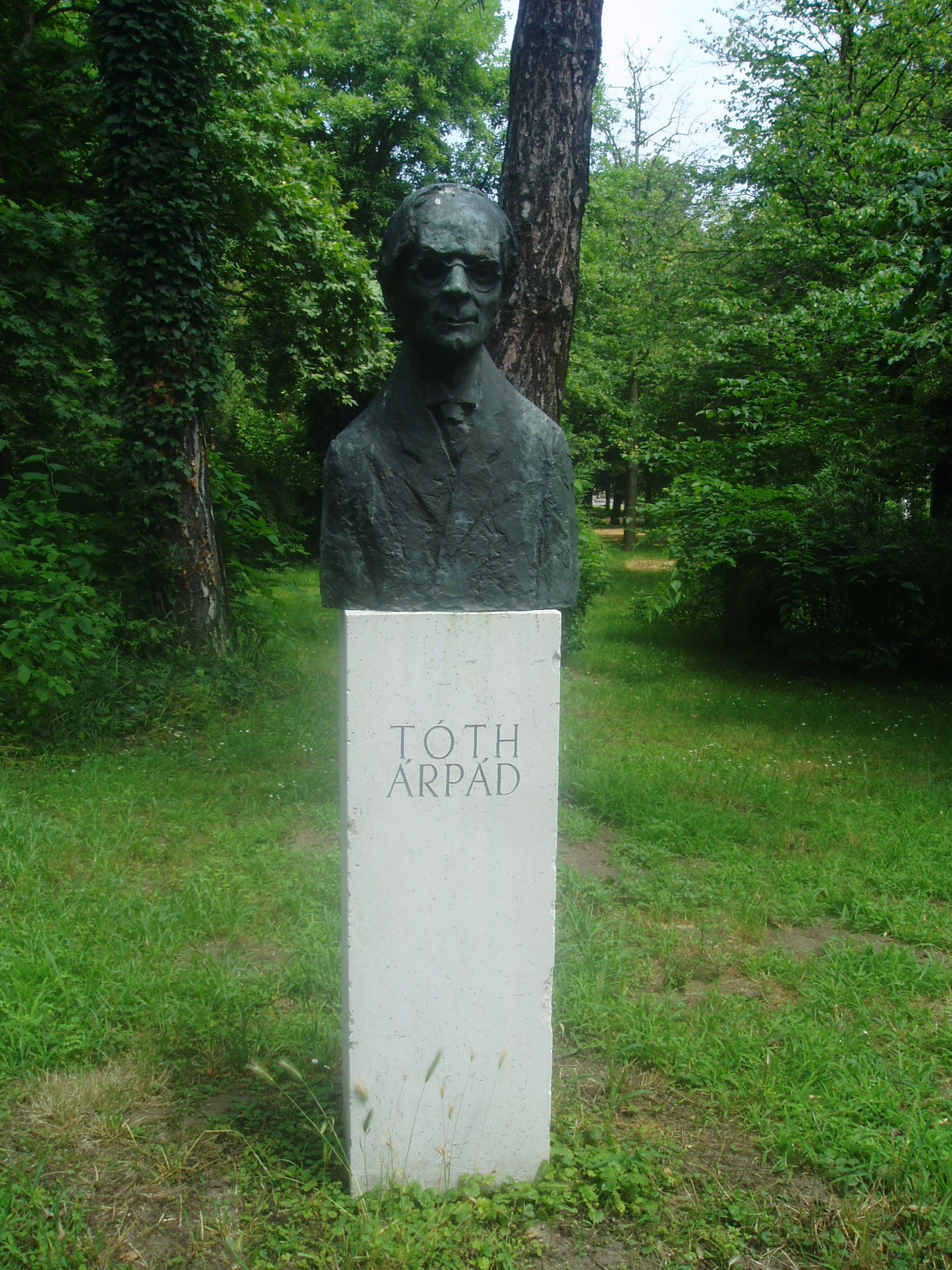 Nyilvános 1261 | 2688 | Debrecen, Medgyessy sétány: Tóth Árpád szobra | A debreceni Nagyerdő területén a városhoz kötődő jeles személyiségek szobrai állnak. Tóth Árpád szobra Borsos Miklós alkotása. A fénykép 2006 júniusában készült. |