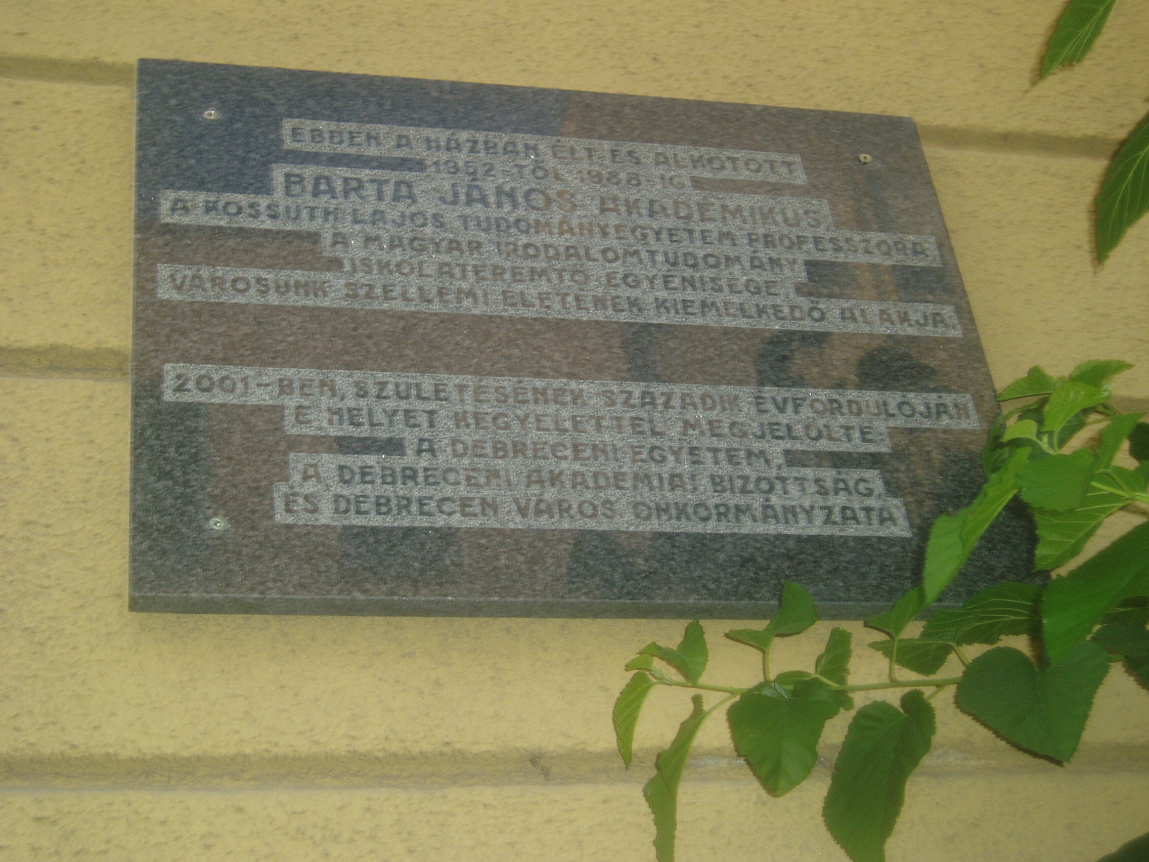 Nyilvános 1215 | 1783 | Debrecen, Múzeum utca 4. | Ebben a házban élt és alkotott 1952 és 1988 között Barta János (1901-1988) irodalomtörténész, egyetemi tanár, a magyar irodalomtudomány iskolateremtő egyénisége. Fő kutatási területe a XIX. századi magyar irodalom volt. Számos irodalmi tankönyv és tudományos közlemény mellett jelentősek Madách Imréről és Arany Jánosról írt művei. A fénykép 2006 júniusában készült. Felh. irod.: www.szentesinfo.hu/cd/helyismeret/emberek/html/oldal5.htm |