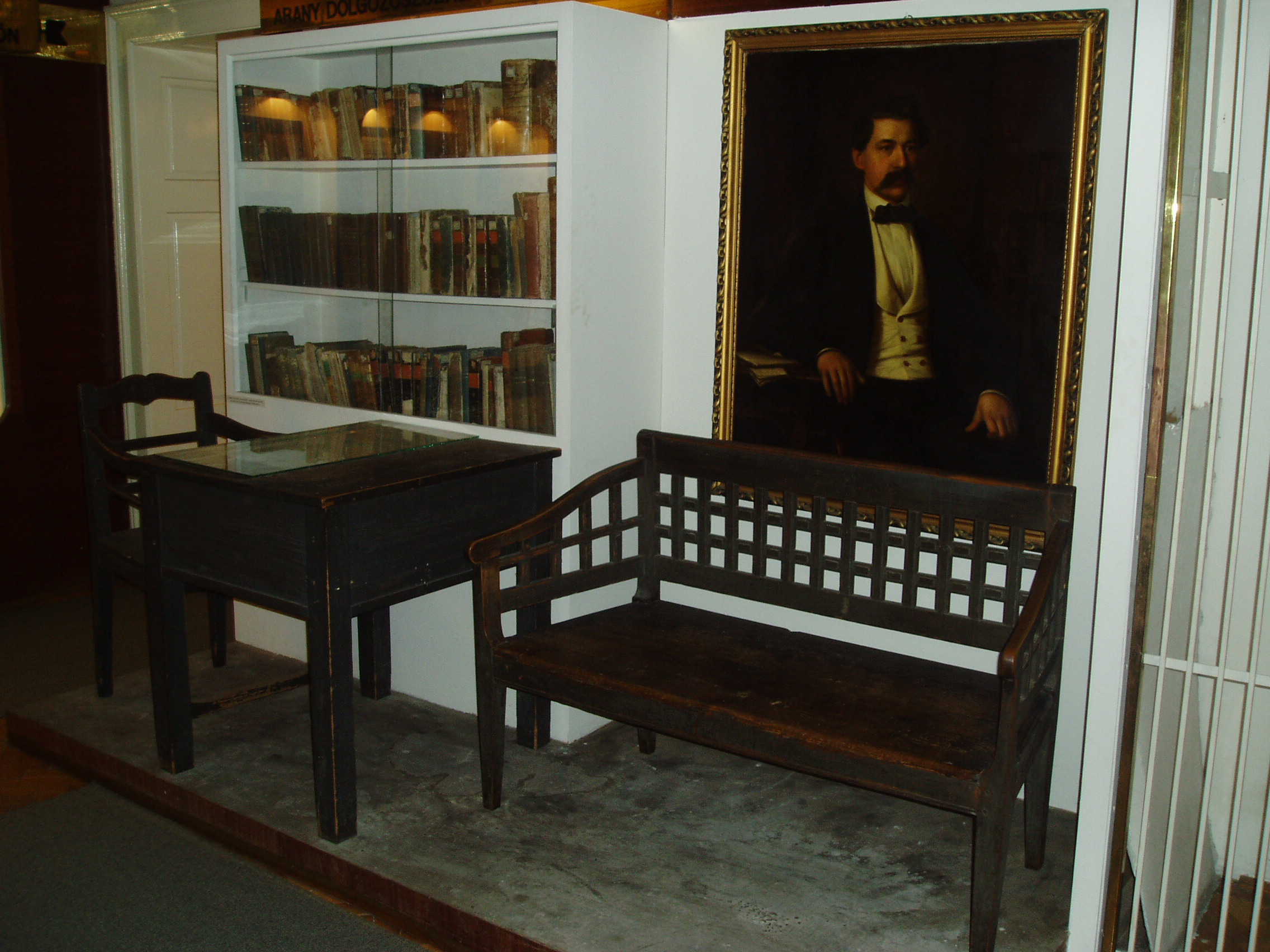 Nyilvános 1721 | 3663 | Nagykőrös, Ceglédi út 19. Arany János Múzeum | Arany János 1851 és 1860 között élt Nagykőrösön, magyart és latint tanított a helyi gimnáziumban. A városban fennmaradt s Arany halála után a családja által adományozott relikviákból 1910-ben Arany-emlékszobát rendeztek be Arany egykori működésének helyén, a gimnáziumban. Később e relikviák az 1928-ban alapított városi, Arany János Múzeumba kerültek, s ma is ott láthatók. A képen Arany János dolgozószobájának bútorai láthatók. A fénykép 2006 augusztusában készült. Felh. irod.: www.c3.hu/~pmiajm/hunnagyk.htm www.vendegvaro.hu Novák László: Arany János Múzeum. Nagykőrös, 2000 Novák László: Arany János Múzeum. Nagykőrös, 2000 Törös László: A nagykőrösi Arany emlékek katalógusa. = A nagykőrösi művelődés hármas kis tüköre. Nagykőrös, 1935 (Sajnálom, a kép nem lett túl jó, de fontossága miatt mégis feltettem: K.K.) |