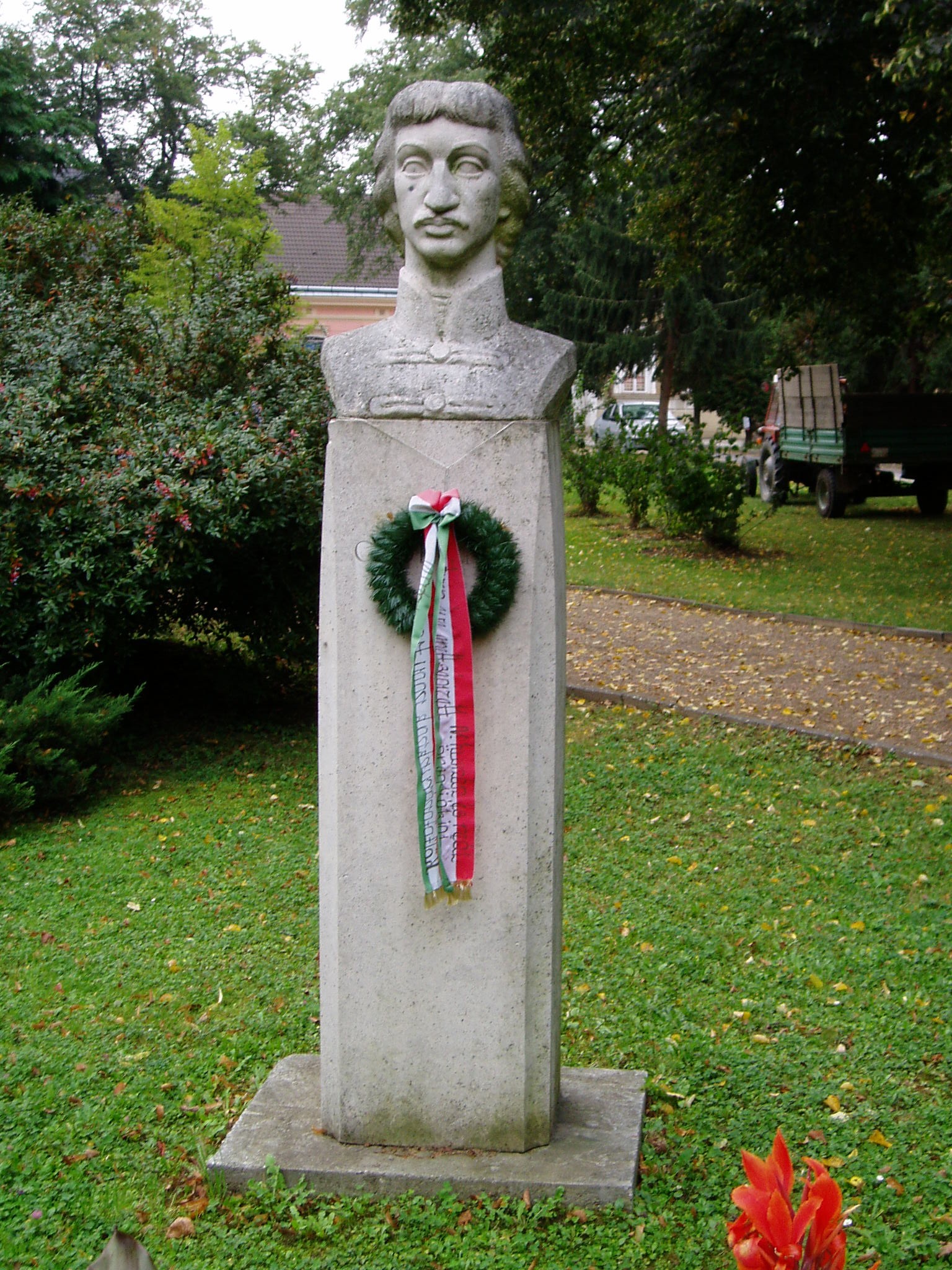 Nyilvános 1152 | 2430 | Csurgó, Széchenyi tér: Csokonai mellszobra | Csokonai Vitéz Mihály 1799/1800-ban helyettesítő tanárként tanított a nem sokkal korábban alapított csurgói gimnáziumban (lásd: Csurgó, Csokonai u. 24.). Modern mellszobra Kamocsay István alkotása. A fénykép 2004 októberében készült. Felh. irod.: Csurgói kalauz. Szerk. Terényi Zoltán. 1974 |