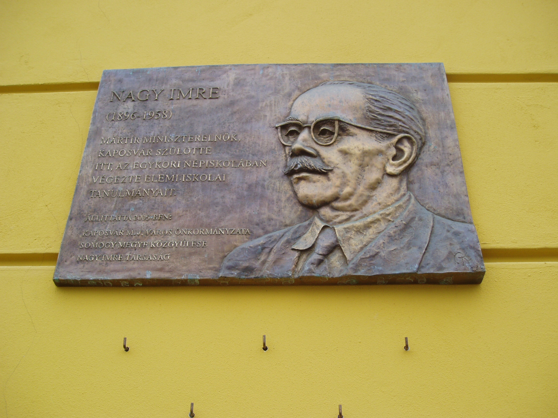 Nyilvános 1213 | 1926 | Kaposvár, Fő utca 44. Kodály Zoltán Ének-Zene Tagozatos Általános Iskola | Mint az épületen elhelyezett emléktálán is olvasható, itt, az egykori népiskolában végezte elemi iskolai tanulmányait Nagy Imre mártír miniszterelnök, Kaposvár szülötte. |