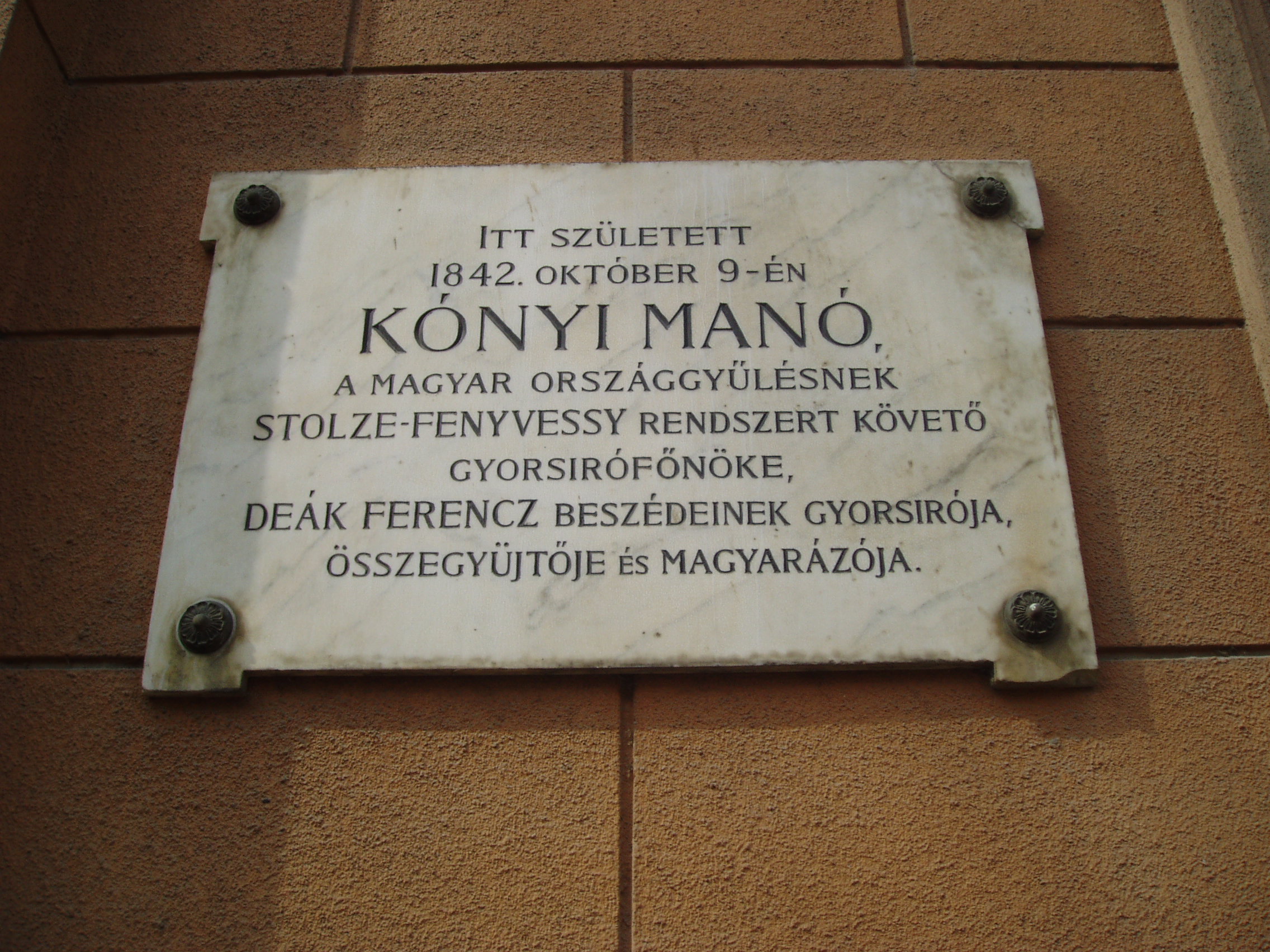 Nyilvános 1213 | 1908 | Kaposvár, Kossuth tér 5. | Az egykori Erzsébet szálló épületét 1901-ben hat hónap alatt készítették el. A sarokerkély feletti saroktorony, valamint a színes Zsolnay-cserepek a városközpont egyik jellegzetes épületévé teszik. A Noszlopy Gáspár utca felőli homlokzaton Kónyi Manó emléktáblája olvasható, aki a szálló helyén korábban állott épületben született. Szövege a következő: "Itt született 1842. október 9-én Kónyi Manó, a magyar országgyűlésnek Stolze-Fenyvessy rendszert követő gyorsírófőnöke. Deák Ferenc beszédeinek gyorsírója, összegyűjtője és magyarázója." A fénykép 2006 márciusában készült. Felh. irod.: Látnivalók Somogy megyében. Miskolc, Well-PRess, 2000 |