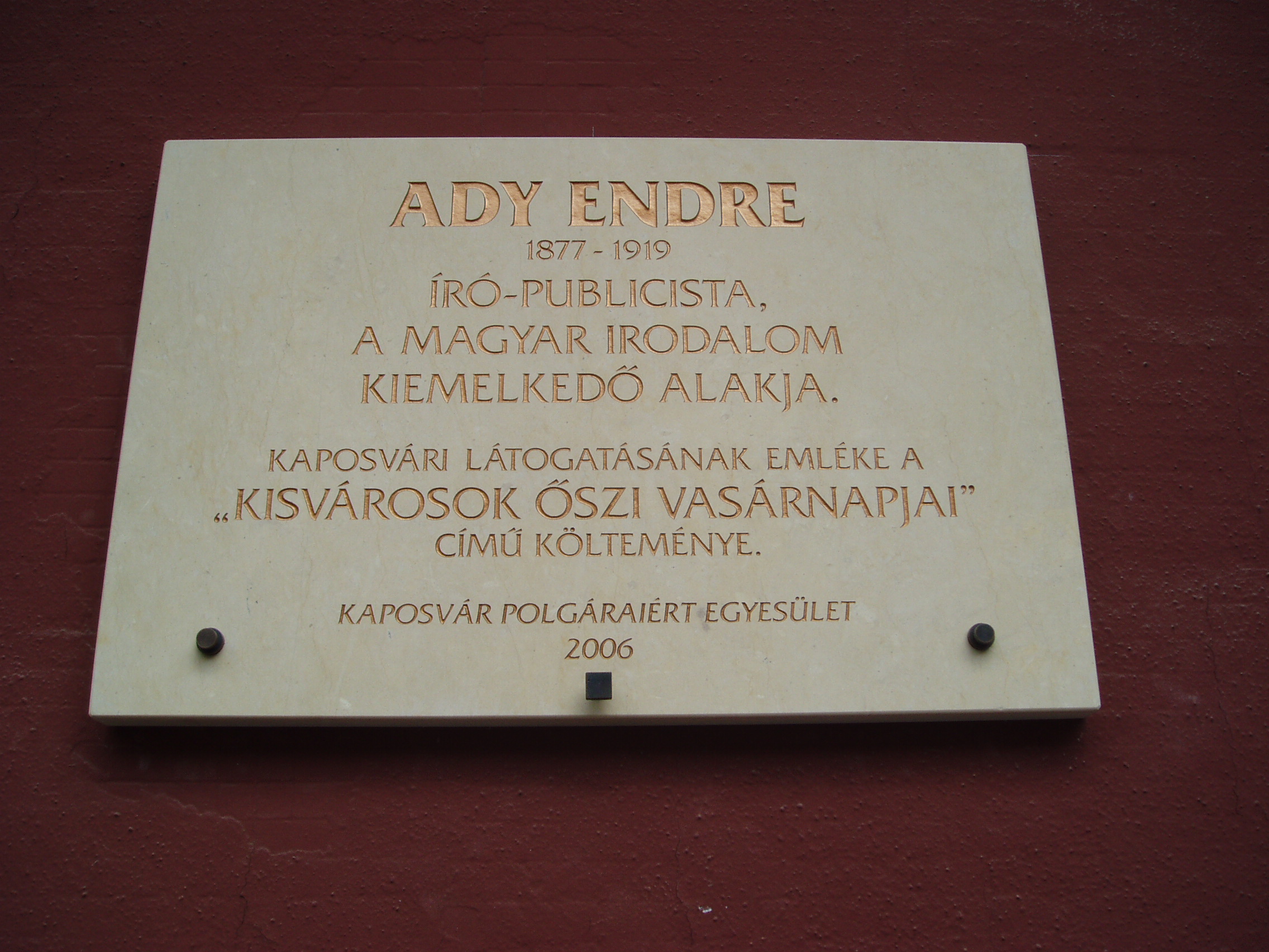 Nyilvános 1314 | 2158 | Kaposvár, Ady utca 2. | A város szívében, a mai Kapos szálloda helyén egykor urasági szálloda állott, amelyet Koronának neveztek. 1860 körül jelentősen bővítették az épületet, majd 1912-ben részben lebontották és teljesen átalakították. A mai jellegtelen épület elődeivel építészetileg semmilyen rokonságot nem mutat. Jelenleg Kapos Szálló néven működik. Egy szöveges és egy domborműves tábla Ady Endre emlékét idézi, aki egykor a Koronában tartott felolvasóestet és itteni élményei alapján írta a „Kisvárosok őszi vasárnapjai” című versét. A XIX. század közepétől a szálloda a város társadalmi és kulturális központja volt. Az 1860-as, 1870-es években, a téli időszakban — állandó színház hiányában — általában itt léptek fel a városba látogató színtársulatok. Itt (is) muzsikált Szimplicisszimusz, a világot járt híres cigányprímás, akit Ausztriából 1872-ben hívtak haza, Kaposvárra. Vendégszerepelt itt zenekarával 1895 nyarán Dankó Pista. A fénykép 2006 márciusában készült. Felh. irod.: Zádor Mihály: Kaposvár. Bp. Műszaki Kiadó, 1964 Látnivalók Somogy megyében. Miskolc, Well-PRess, 2000 |