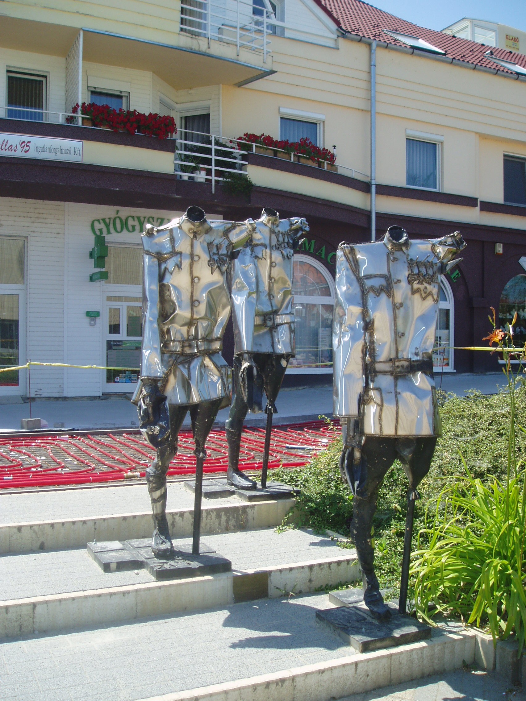 Nyilvános 1274 | 2558 | Siófok, Fő tér: Varga Imre: Mementó a II. Magyar Hadseregért | Varga Imre szobrászművész 1923. november 1-jén született Siófokon. Már gyermekkorában - a siófoki elemi iskolában - rendkívül jó rajzkészségével tűnt ki. 13 évesen szerepelt egy képével Párizsban. A képzőművészet terén elért kimagasló érdemeiért, amellyel Magyarország és Siófok város hírnevét is öregbítette, 1985-ben ő lett Siófok város első díszpolgára. Hazai és külföldi tereken, templomokban, középületekben mintegy 300 alkotását helyezték el. Szobrai állnak Belgiumban, Franciaországban, Lengyelországban, Németországban, Norvégiában és Izraelben. Siófokon a Fő téren szabadtéri szoborkiállítása látható. A képen Mementó a II. Magyar Hadseregért című megrendítő szoborkompozíciója látható. A fénykép 2006 júliusában készült. Felh. irod.: http://www.siofok.com/uj/object/varga-hu.html |