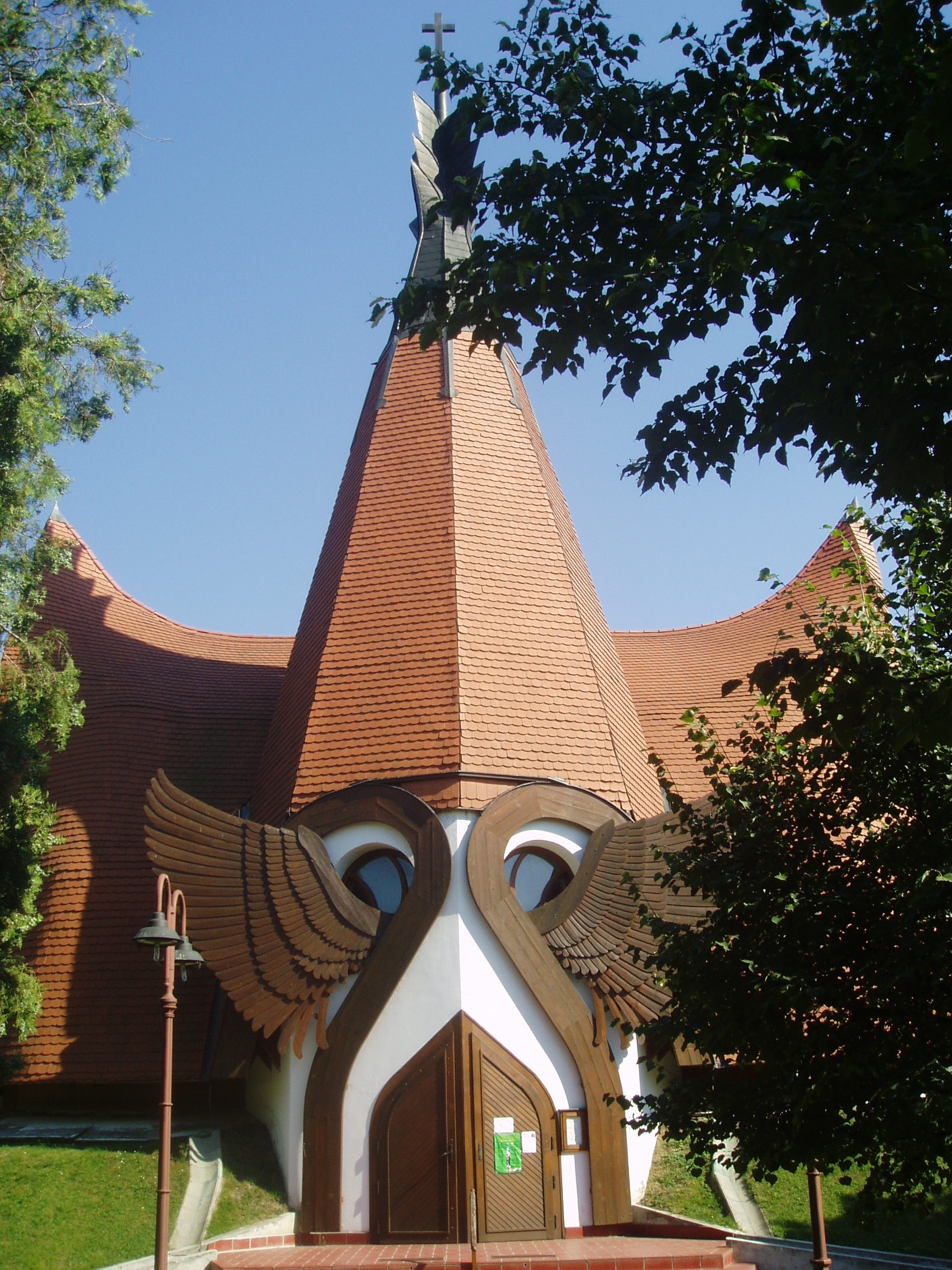 Nyilvános 1242 | 2363 | Siófok, Oulu park: Evangélikus templom | A Siófok finn testvérvárosáról elnevezett parkban található az ország legszebb és legmodernebb evangélikus temploma. Építéséhez a finn testvérváros evangélikus gyülekezete is jelentősen hozzájárult. Az építészetileg igazi különlegességnek számító, a népi építészet hagyományait a legmodernebb eszközökkel ötvöző templom Makovecz Imre tervei alapján 1990-ben épült. Ezen az épületen is, mint Makovecz legtöbb alkotásán a fa - mint természetes építőanyag - dominál. A torony tetején, az életfából kinövő kereszt azt jelképezi, hogy a golgotai kereszt nem a halálé, hanem utat mutat az örök élethez. A négykapus, 120 férőhelyes templom főbejárata fölött angyalszárnyak vigyázzák a belépőt. A keleti tájolású oltár fölött Péterffy László: A feltámadott szobra című alkotása látható. A templom 2004-ben az Aquincumi Orgonagyár által készített hangversenyorgonával gazdagodott. A fénykép 2006 júliusában készült. Felh. irod.: www.vendegvaro.hu Orgonaépítés a siófoki Makovecz-templomban. = Evangélikus Élet 2004. 9. |