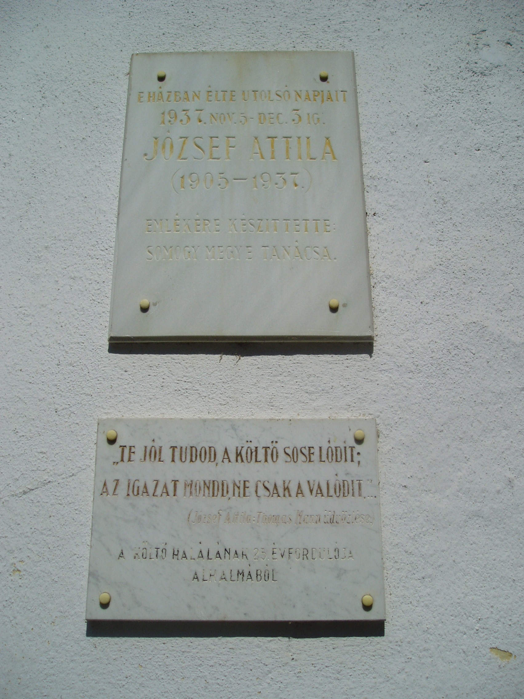 Nyilvános 1600 | 3906 | Balatonszárszó, József Attila utca 7. József Attila Emlékmúzeum | A balatonszárszói villasoron lévő egykori Horváth-panzióban töltötte élete utolsó heteit József Attila 1937. november 5. és december 3. között. A költő több hónapos szanatóriumi kezelés után érkezett ide, nővéreihez. Eredetileg az akkor már özvegy Etus balatonparti panziójában lakott a három testvér, de fűtési nehézségek miatt később itt, a faluban béreltek szobát. A költő innen indult el utolsó, végzetes útjára. Halálát az 1284-es számú tehervonat kerekei alatt lelte (lásd: Balatonszárszó, Vasútállomás /régi/). Halála előtt itt látogatták meg barátai, köztük Fejtő Ferenc. Az egykori panzió 1957-től szolgál József Attila életművének bemutatására. Új állandó kiállítása "Az utca és a föld fia" címmel 1997-ben, a költő születésnapján - április 11-én - nyílt meg. A Petőfi Irodalmi Múzeum anyagából rendezett tárlaton fotók, iratok, kéziratmásolatok, művészeti alkotások állítanak emléket a XX. század egyik legnagyobb magyar költőjének. Látható itt például József Attila íróasztala, rajta írógépe és más relikviái. Kiállították azt az ingét is, amelyben meghalt, s amelynek fél ujja hiányzik. Különösen szívszorító, amikor a látogatónak egy vasúti sínpáron kell átkelnie... A fénykép 2007 júniusában készült. Felh. irod.: www.smmi.hu/torteneti/bszarszo.htm József Jolán: József Attila élete. Bp. Szépirodalmi Kiadó, 1955 Valachi Anna: József Jolán, az édes mostoha. Bp. Papirusz Book, 2008 Mózes Bálint: Mindent kiírt magából [beszélgetés Fejtő Ferenccel]. = www.index.hu 2005. 04. 11. |
