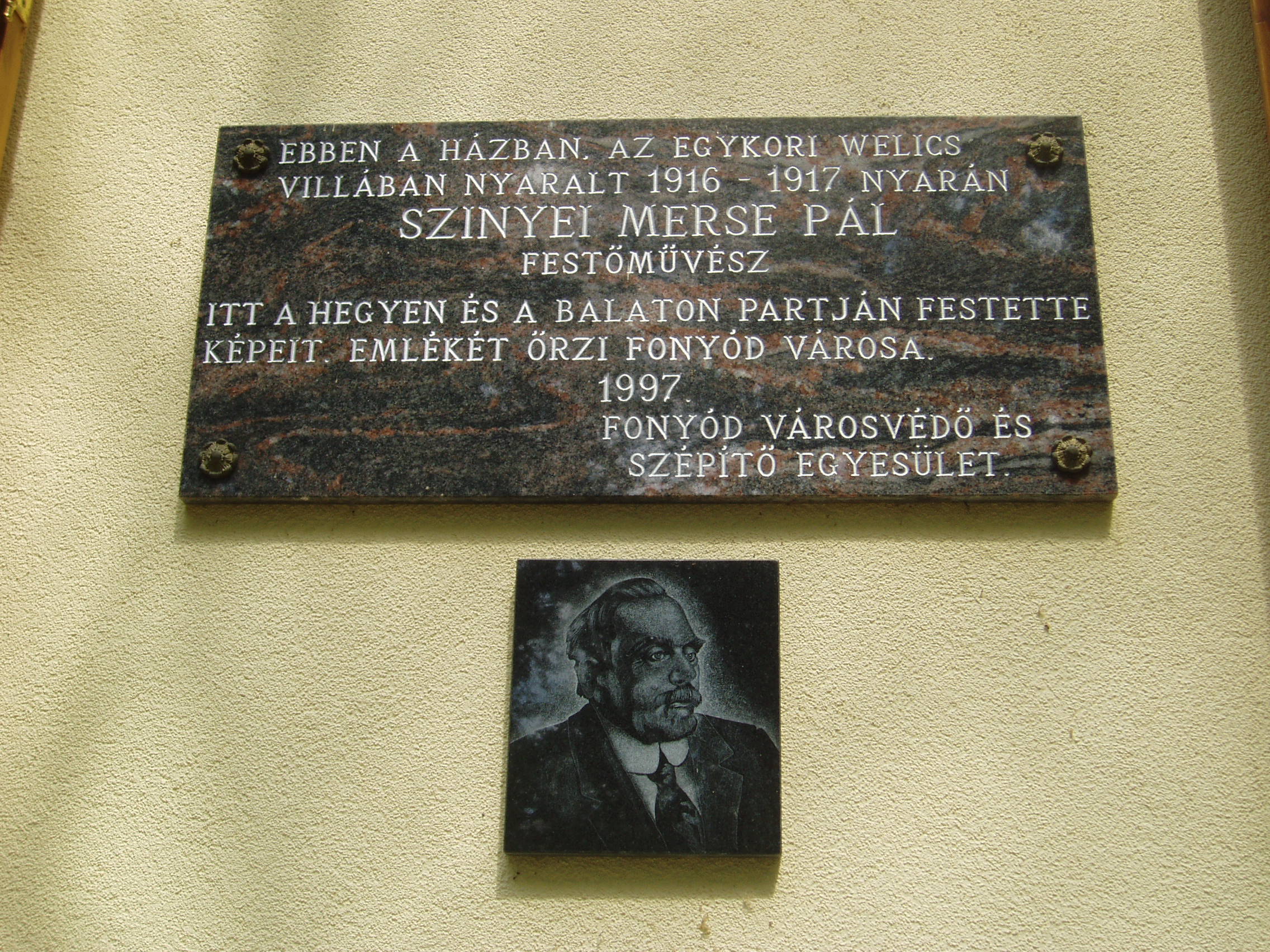 Nyilvános 1263 | 2044 | Fonyód, Bartók Béla utca 3. Természetvédelmi és Helytörténeti Múzeum | A fonyódi Várhegyen kialakult Bélatelephez tartozó, a Balaton egyik legszebb panorámájú helyén álló villát az orvosi doktorátussal rendelkező, többek között Kelet-kutatóként is számon tartott lászlófalvi Velics Antal (1875-1915) építtette az 1900-as évek elején. Ebben a villában töltötte 1916 és 1917 nyarát Szinyei Merse Pál (1845-1920), hazánk egyik legkiválóbb festőművésze. Az idős mester a háború miatt nem tuditt Jernyére, kedves szülőföldjére utazni, mint általában minden nyáron, így került Fonyódra. Vele tartott akkor már özvegy leánya és annak két kisfia. A csintalan gyerekekre Molnár C. Pál festőművész, akkor másodéves növendék vigyázott, aki emlékeit 1944-ben publikálta a Szépművészet c. folyóiratban. Szinyei Merse az első nyáron hat, a másodikon négy képet festett - köztük a Háborgó Balaton, A Balaton a fonyódi partról, a Kilátás Fonyódról című képeket. Alkotás közben nem zavarhatta senki, családtagjai sem. Érdekes módon a művész kerülte, hogy, szemből ábrázolja Badacsonyt. Nem szerette a hegyet, mely szerinte méretével és koporsó formájával megbontja a túlsó part harmonikus összképét. Szinyei Merse Pál emléktábláját 1997-ben avatták fel az épület falán. Az avatóbeszédet a festőművész dédunokája, Szinyei Merse Anna muzeológus tartotta. Az egykori Velics-villa az 1980-as évek végéig moziként üzemelt. Felújítása után, 2004-ben nyílt meg termeiben a fonyódi Természetvédelmi és Helytörténeti Múzeum. Benne a Fonyód történetét és néprajzát bemutató állandó kiállítás mellett időszaki kiállításokat is rendeznek. A fénykép 2007 júliusában készült. Felh. irod.: http://muzeum.fonyod.hu/ Molnár C. Pál: Szinyei Merse Pál Fonyódon. = Szépművészet 1944. március Szinyei Merse Anna: Szinyei Merse Pál élete és művészete. Bp. Corvina, 1990 Szinyei Merse Félix: Szinyei Merse Pál fonyódi nyaralása. = Magyar Nemzet 1983. július 19. |