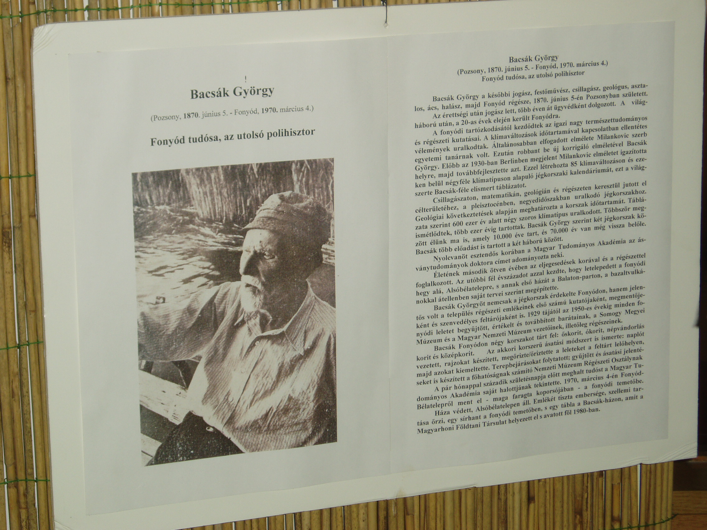Nyilvános 1166 | 1942 | Fonyód, Bartók Béla utca 3. Természetvédelmi és Helytörténeti Múzeum - Bacsák György | A fonyódi Várhegyen kialakult Bélatelephez tartozó, a Balaton egyik legszebb panorámájú helyén álló villát az orvosi doktorátussal rendelkező, többek között Kelet-kutatóként is számon tartott lászlófalvi Velics Antal (1875-1915) építtette az 1900-as évek elején. Az épület az 1980-as évek végéig moziként üzemelt. Felújítása után, 2004-ben nyílt meg termeiben a fonyódi Természetvédelmi és Helytörténeti Múzeum. Benne a Fonyód történetét és néprajzát bemutató állandó kiállítás mellett időszaki kiállításokat is rendeznek. Az állandó kiállítás megemlékezik Bacsák Györgyről (1870-1970), Fonyód tudósáról is. Az utolsó polihisztor - jogász, festőművész, csillagász, geológus, asztalos, ács, halász, majd Fonyód régésze - 1870. június 5-én Pozsonyban született. Érettségi után a budapesti Pázmány Péter Tudományos Egyetem jogi karán szerzett jogászdoktori oklevelet, de elvégezte a festőakadémiát is kezdve Budapesten, majd befejezve Münchenben. Több éven át ügyvédként dolgozott és az elesettek, a kis és szegény emberek ügyeivel foglalkozott majd jogtanácsosként működött. Az első világháború után, az 1920-as évek elején került át a Csallóközből előbb a Fejér megyei Hörcsökre, majd Fonyódra. Házát (Báthory utca 5.) a fonyódi hegy alatt saját kezűleg építette. Ekkortól kezdődtek igazi nagy természettudományos és régészeti kutatásai. Létrehozta 85 klímaváltozáson és ezeken belül négyféle klímatípuson alapuló jégkorszaki kalendáriumát, ezt a világszerte elismert táblázatot. Mint a fonyódi könyvtár honlapján közzétett megemlékezésben olvasható, matuzsálemi korában is derűs lelkületű, magányában is a természet ölében élő bölcs ember maradt. Amilyen szálfaegyenes volt alakja, olyan egyenes volt a jelleme is. Egész lényéből áradt a derű, nyílt és közvetlen emberként ismerték. Mindenki által tisztelt, szókimondó ember volt. Szelleme, lelke, munkakedve, munkabírás friss, töretlen maradt egészen haláláig. A száz éves korában elhunyt legendás tudós maga faragta koporsójában nyugszik a fonyódi temetőben. Villája védett épület, rajta emléktáblájával. A fénykép 2007 júliusában készült. Felh. irod.: http://muzeum.fonyod.hu/ http://konyvtar.fonyod.hu/bacsak.htm |