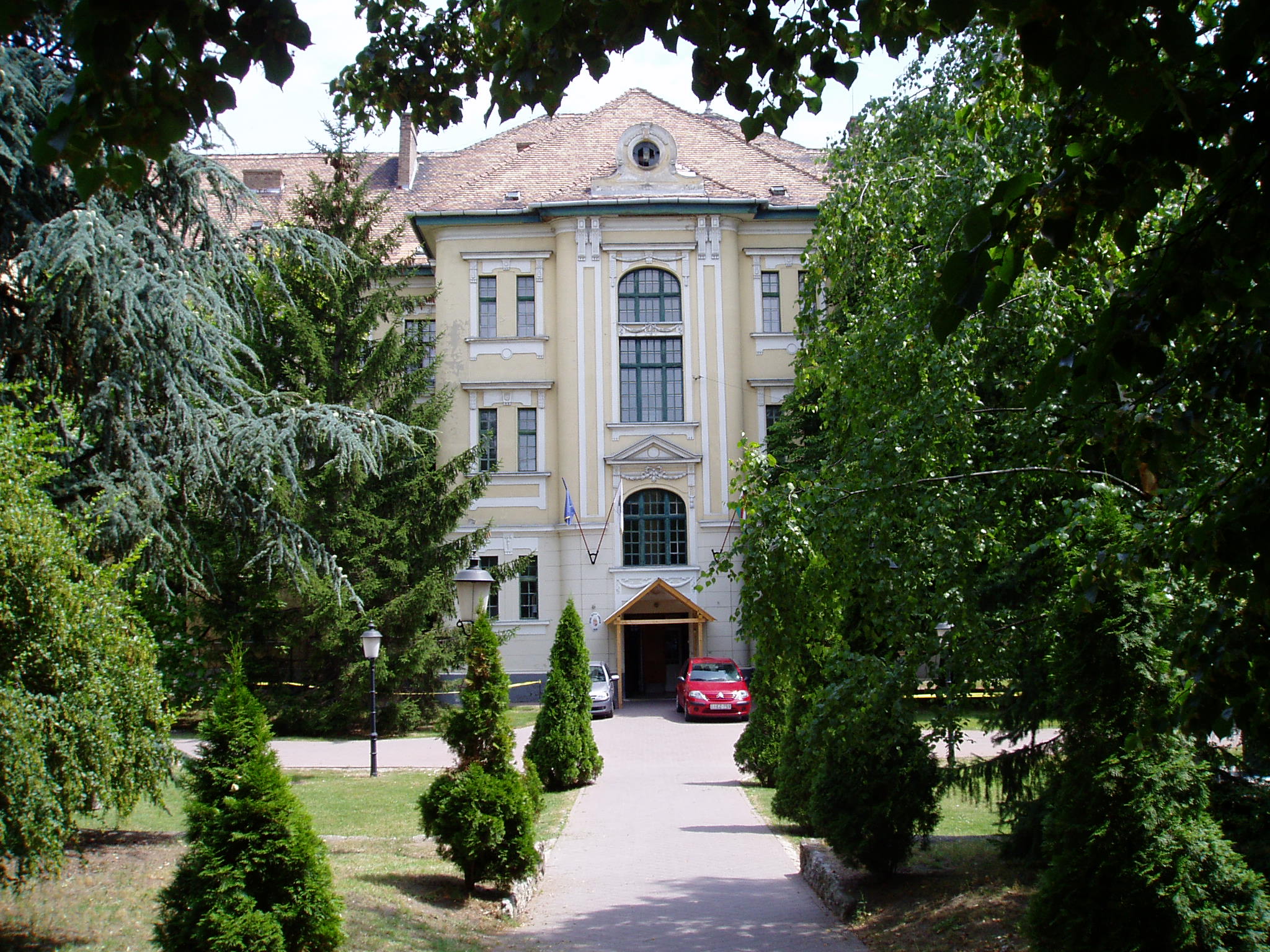 Nyilvános 1615 | 3325 | Tata, Tanoda tér 5. Eötvös József Gimnázium | A tatai gimnáziumot 1765-ben gróf Esterházy Miklós alapította, s vezetésére a piarista tanítórendet kérte fel. Az iskola kezdetben a közeli majki kamalduli szerzetesek többször is átalakított gazdasági épületeiben működött. A jelenlegi iskolaépületet a XX. század elején emelték, 1912-ben kezdődött meg benne a tanítás. A fénykép 2005. júliusában készült. Felh. irod.: www.eotvos-tata.sulinet.hu Wehner Tibor: Tatai szobrok, emlékművek, emléktáblák. Tata, 1980 Polgárdy Géza: Tatatóváros és környéke kalauza. Az 1939-es kiadás reprintje. Tata, Móricz Zsigmond Városi Könyvtár, 1998 |