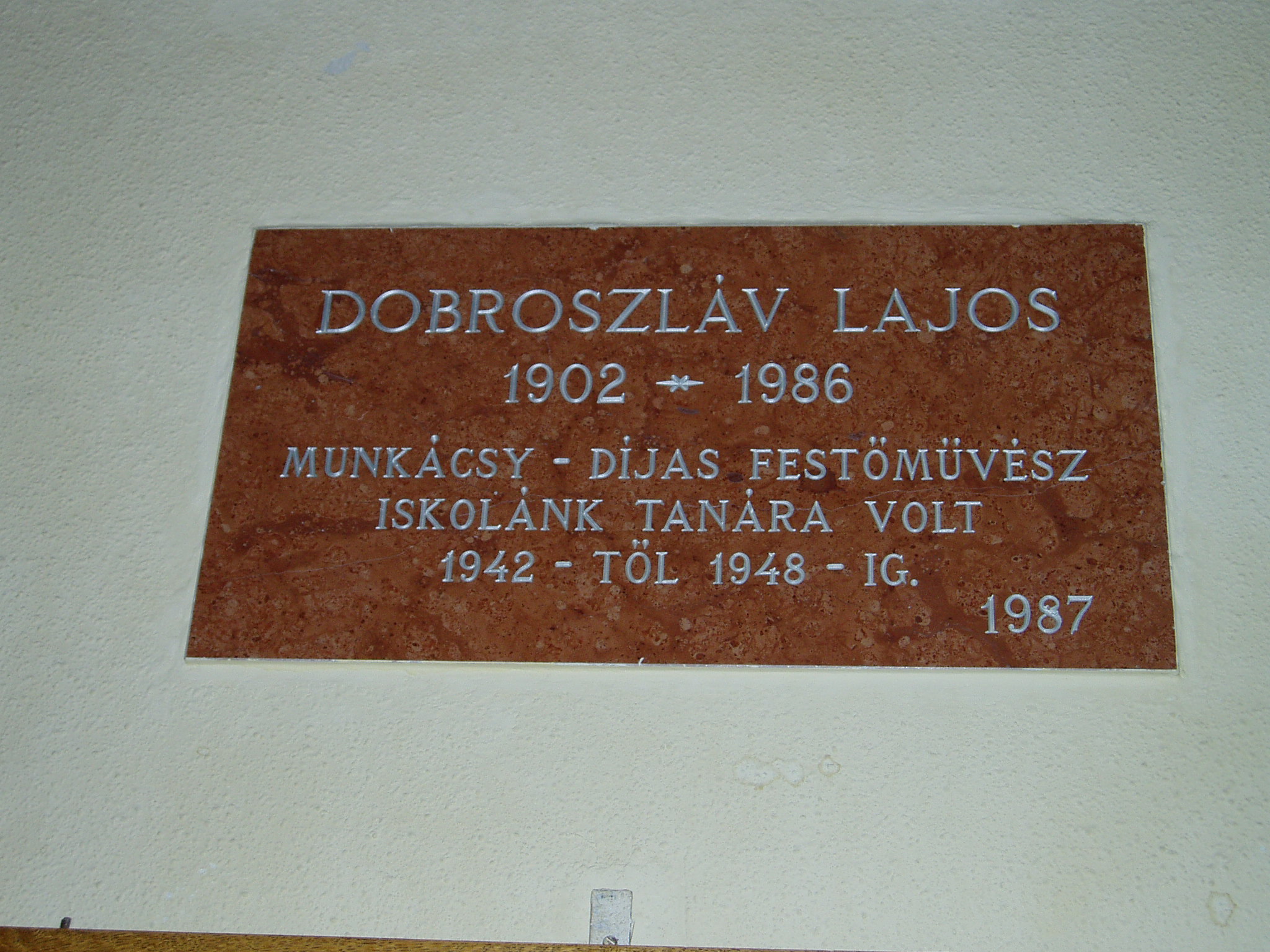 Nyilvános 1486 | 3974 | Tata, Tanoda tér 5. Eötvös József Gimnázium: Dobroszláv Lajosemléktáblája | A tatai gimnáziumot 1765-ben gróf Esterházy Miklós alapította, s vezetésére a piarista tanítórendet kérte fel. Az iskola kezdetben a közeli majki kamalduli szerzetesek többször is átalakított gazdasági épületeiben működött. A jelenlegi iskolaépületet a XX. század elején emelték, 1912-ben kezdődött meg benne a tanítás. Az első emeleti folyosó falán neves egykori tanárok és diákok emléktábláit helyezték el. Dobroszláv Lajos (1902-1986) Munkácsy-díjas festőművész 1942 és 1948 között a gimnázium tanára volt. 1948-ban, a piarista gimnázium államosításakor általános iskolába helyezték át, 1950-ben onnét is elbocsátották. Mivel ugyanebben az évben elnyerte a Munkácsy-díjat, megbízták a tatai állami múzeum megszervezésével. 1954-ig volt a múzeum igazgatója, nehéz politikai légkörben. Az 1939 óta kiállító művész, akit a magyar akvarellfestészet nagy mesterének ismernek el, haláláig Tatán élt. A fénykép 2005. júliusában készült. Felh. irod.: www.eotvos-tata.sulinet.hu Wehner Tibor: Tatai szobrok, emlékművek, emléktáblák. Tata, 1980 Kövesdi Mónika: Száz éve született Dobroszláv Lajos. = Új Forrás 2003. 3. |