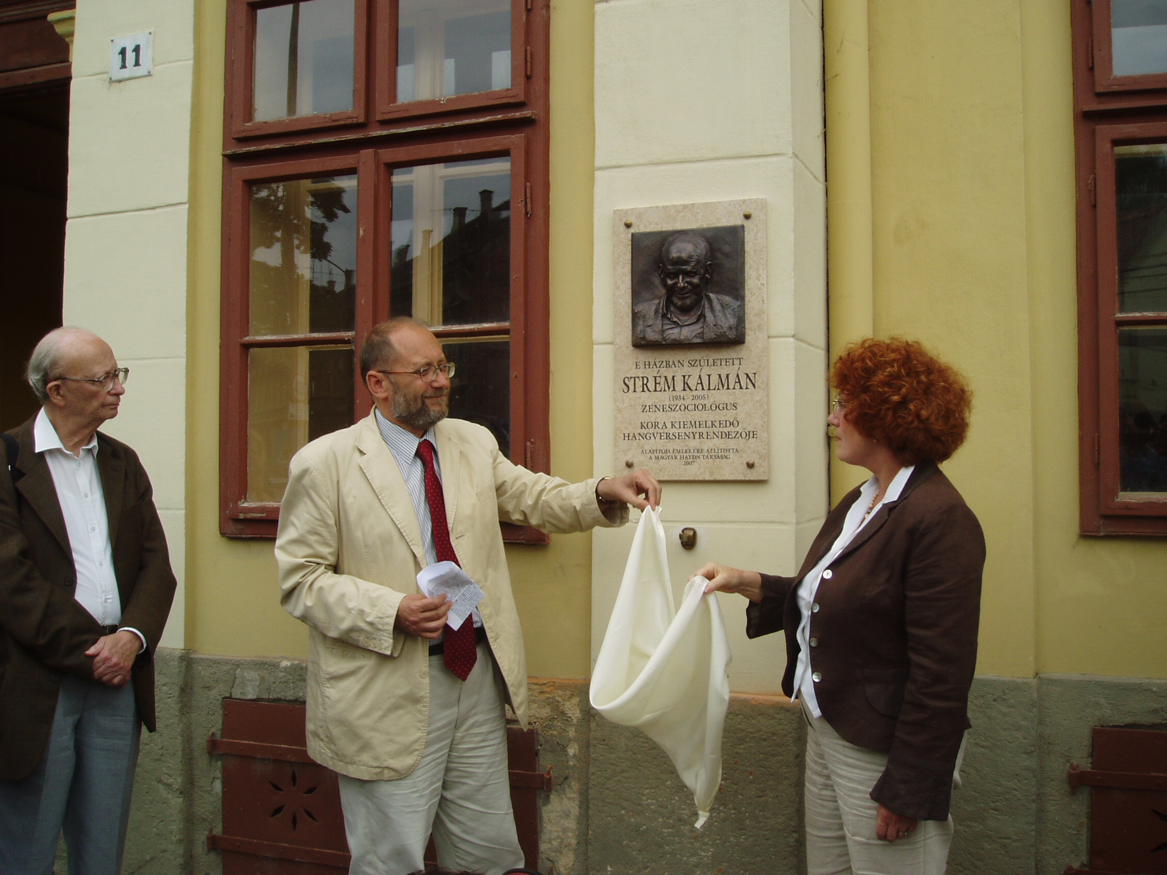 Nyilvános 2223 | 5102 | Strém Kálmán emléktáblájának felavatása 2007. május 28-án Nagykanizsán, Erzsébet tér 11. számú szülőházán. A táblát a Magyar Haydn Társaság állította, az eseményt a Kanizsai Klasszikusok Kulturális és Közhasznú Alapítvány rendezte. | A képen Földes Imre zenetörténész, Malina János zenetörténész, a Magyar Haydn Társaság elnöke és dr. Gerő Katalin, az emléktábla alkotója. Strém Kálmán (1934-2005) zeneszociológus, hangversenyrendező, a legjelentősebb hazai koncertrendező iroda vezetője 1934. május 23-án született Nagykanizsán az Erzsébet tér 11. számú épületben, az ún. Gutmann–palotában. Évtizedekig tevékenykedett az Országos Filharmóniánál, ahol a vidéki osztály vezetőjeként felbecsülhetetlen értékű munkát végzett. 1978-ban a Zeneművész Szövetség ügyvezető titkára lett, ezen a posztján húsz évig tevékenykedett. Közben olyan, a magyar zenei élet húsbavágó kérdéseiről publikált nagyhatású könyveket, mint a Hol vannak a magyar vonósok?, a Lemorzsolódás a zeneiskolákban és a Vitairat a magyar zenei művelődésről. A magyar zenei élet jobbítására közreadott javaslatai közül a — mára sajnos megszüntetett — zenei menedzserképzést ő indíthatta el a Zeneakadémián. A menedzselést nemcsak tanította, hanem a rendszerváltást követően maga is vállalkozni kezdett, s létrehozta a Strém Koncert Kft.-t, amely hamarosan a legnagyobb nem állami hangversenyrendező irodává vált. Strém Kálmán e minőségében is példamutató, áldozatos munkát végzett. Tevékenységének egyik fő iránya a magyarországi Haydn–kultusz erősítése volt: megszervezte és működtette a Fertőd–Eszterházai Nyári Fesztiválokat. Hangversenyrendezői munkájának másik pólusán a kortárs zene állott: ő hívta életre Balatonföldváron a Földvári Zenei Napokat, ahol igaz összművészeti kulturális műhelyt hozott létre (sajnos, mára ez a rendezvénysorozat is megszűnt). Hangversenyeit mindig a legnagyobb gondossággal, európai ízléssel rendezte meg. S bár ő maga nem volt muzsikus, de — mint egy tisztelője megfogalmazta — a hangversenyrendezést művészi fokon művelte. 2005. november 27-én bekövetkezett hirtelen halálával egy korszak zárult le a magyar zenei életben. Batta András, a Zeneakadémia rektora a következő szavakkal méltatta őt: "Olyan fajta ember volt, akiről azt hittük soha nem öregedik meg és nem fárad el. Élete volt a zene és a zene közvetítése. Évente százával szervezett, rendezett hangversenyeket, állt ki jó ügyek mellett, fedezett fel fiatal tehetségeket, adta meg a tiszteletet idős művészeknek." Halála óta már két emléktáblát avattak tiszteletére: Székesfehérváron a Szent István Művelődési Központban és a budapesti Liszt Ferenc Zeneművészeti Egyetemen. Most nagykanizsai szülőházára került fel emléktábla, emlékező beszédet Malina János zenetörténész, a Magyar Haydn Társaság elnöke tartotta. Az eseményt — természetesen — hangverseny is követte a Jézus Szíve templomban, amelyen Földes Imre tanár úr idézte fel Strém Kálmán alakját a közönség előtt. A hangversenyen közreműködtek: Horváth Anikó (csembaló), Kelemen Barnabás (hegedű), Kokas Katalin (hegedű és brácsa), Kokas Dóra (cselló). |