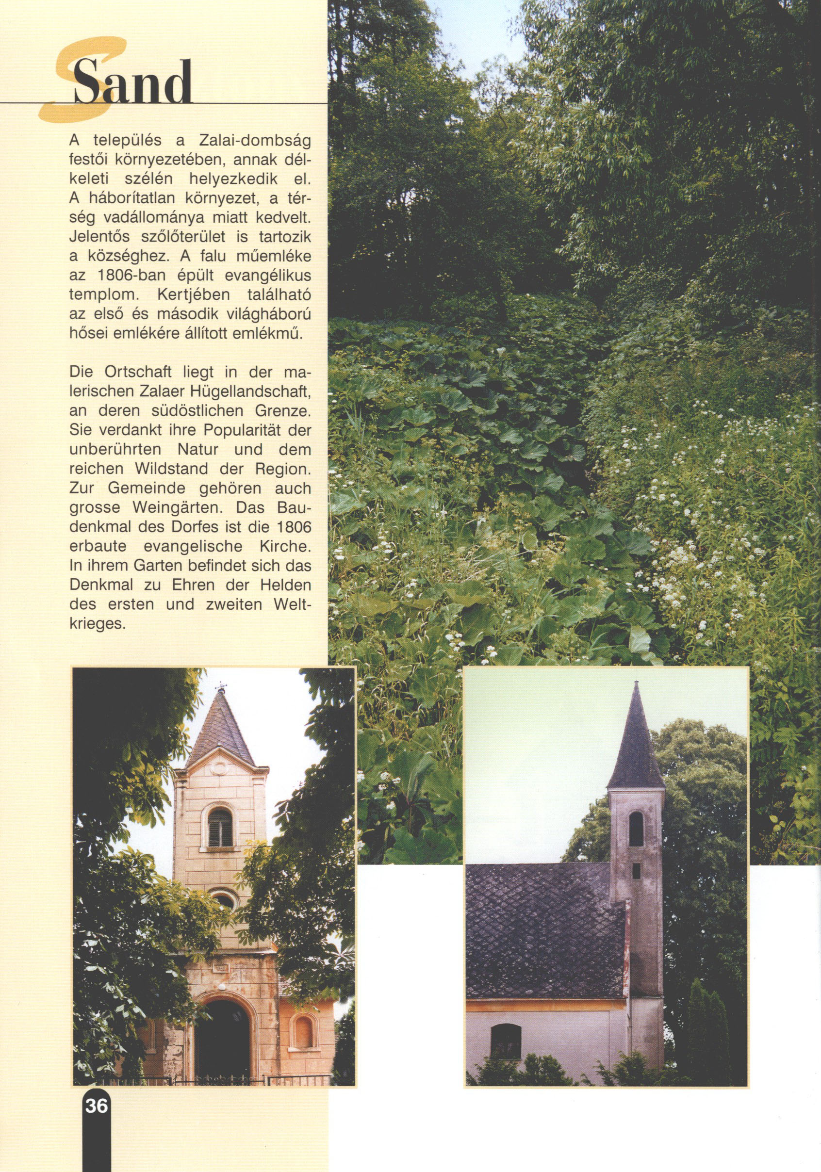 Nyilvános 2413 | 7472 | Sand | Die Ortschaft liegt in der malerischen Zaiaer Hügellandschaft, an deren südöstlichen Grenze. Sie verdankt ihre Popularität der unberührten Natur und dem reichen Wildstand der Region. Zur Gemeinde gehören auch grosse Weingärten. Das Baudenkmal des Dorfes ist die 1806 erbaute evangelische Kirche. In ihrem Garten befindet sich das Denkmal zu Ehren der Helden des ersten und zweiten Weltkrieges. Dieses Text stammt von: Titel: Hívogató a Régiók Kapujában - Útikönyv Látnivalók Nagykanizsán és Térségében (Einladend in dem Tor des Gebiets - Reisebuch - Sehenswürdigkeiten in Nagykanizsa und Umgebung) Herausgegeben von: Nagykanizsa és a Környező Települések Területfejlesztési Társulása (Verein für Gebietsentwicklung in Nagykanizsa und in ihrer Umgebung) 8800 Nagykanizsa, Petőfi Sándor út 5. Tel.: 06 93/536-453 • 06 93/536-454 Tel ./Fax: 06 93/326-323 E-mail: terstars@axelero.hu www.kanizsaterseg.celodin.hu |