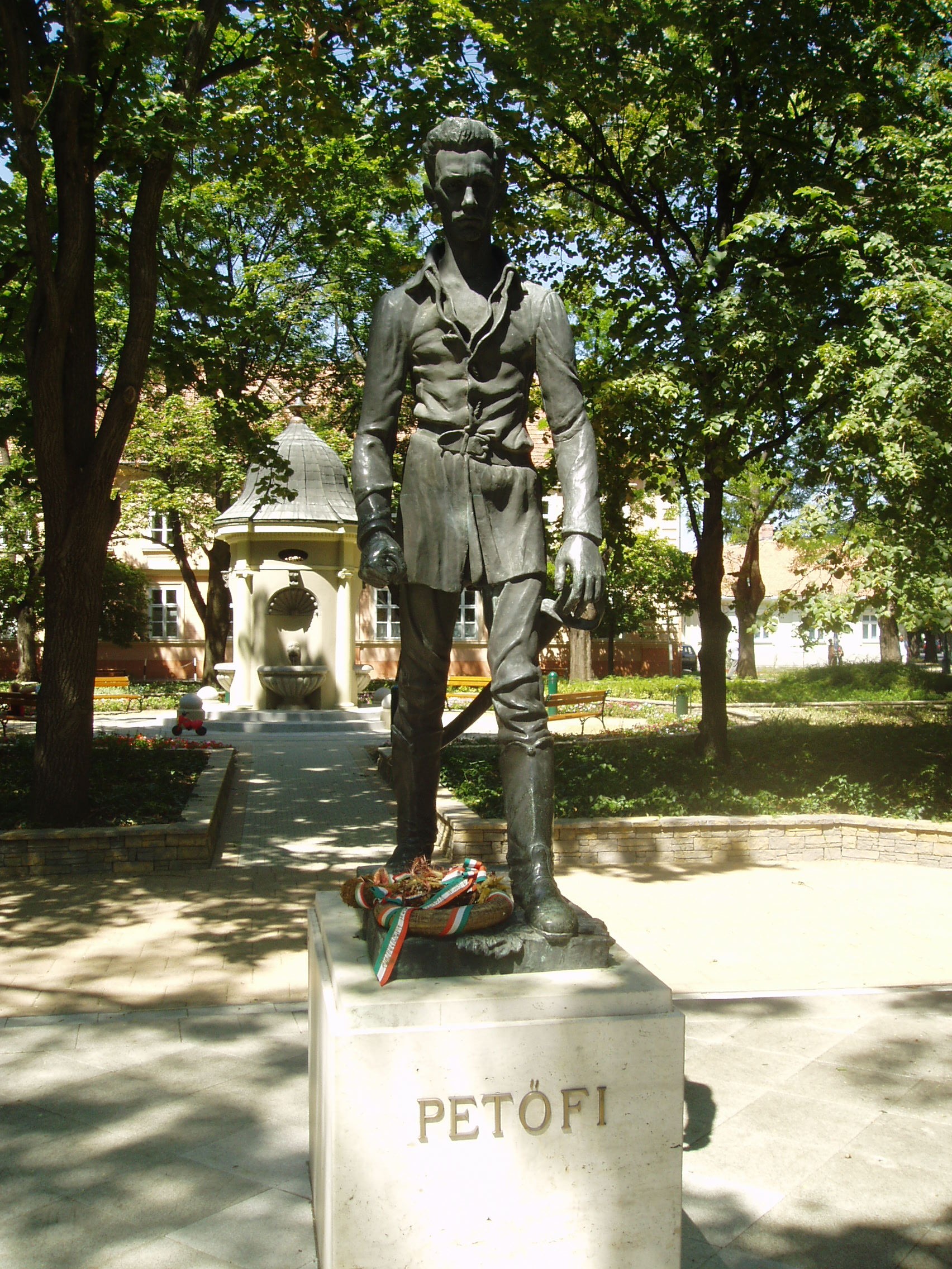 Nyilvános 1157 | 2748 | Gyula, Petőfi tér: Petőfi Sándor szobra | A városközponti háromszög alakú hangulatos tér csaknem minden épülete történelmi vagy műemléki érték. A tér közepén Petőfi Sándor egészalakos szobra áll. Leleplezésekor, 1960-ban sokat vitatták az alkotást, mára azonban a legjobb Petőfi-ábrázolások között tartják számon Ferenczy Béni művét. A fénykép 2007 júliusában készült. Felh. irod.: Czeglédi Imre: Gyula útikalauz. 2. jav., bőv. kiad. Gyula, 1995 |