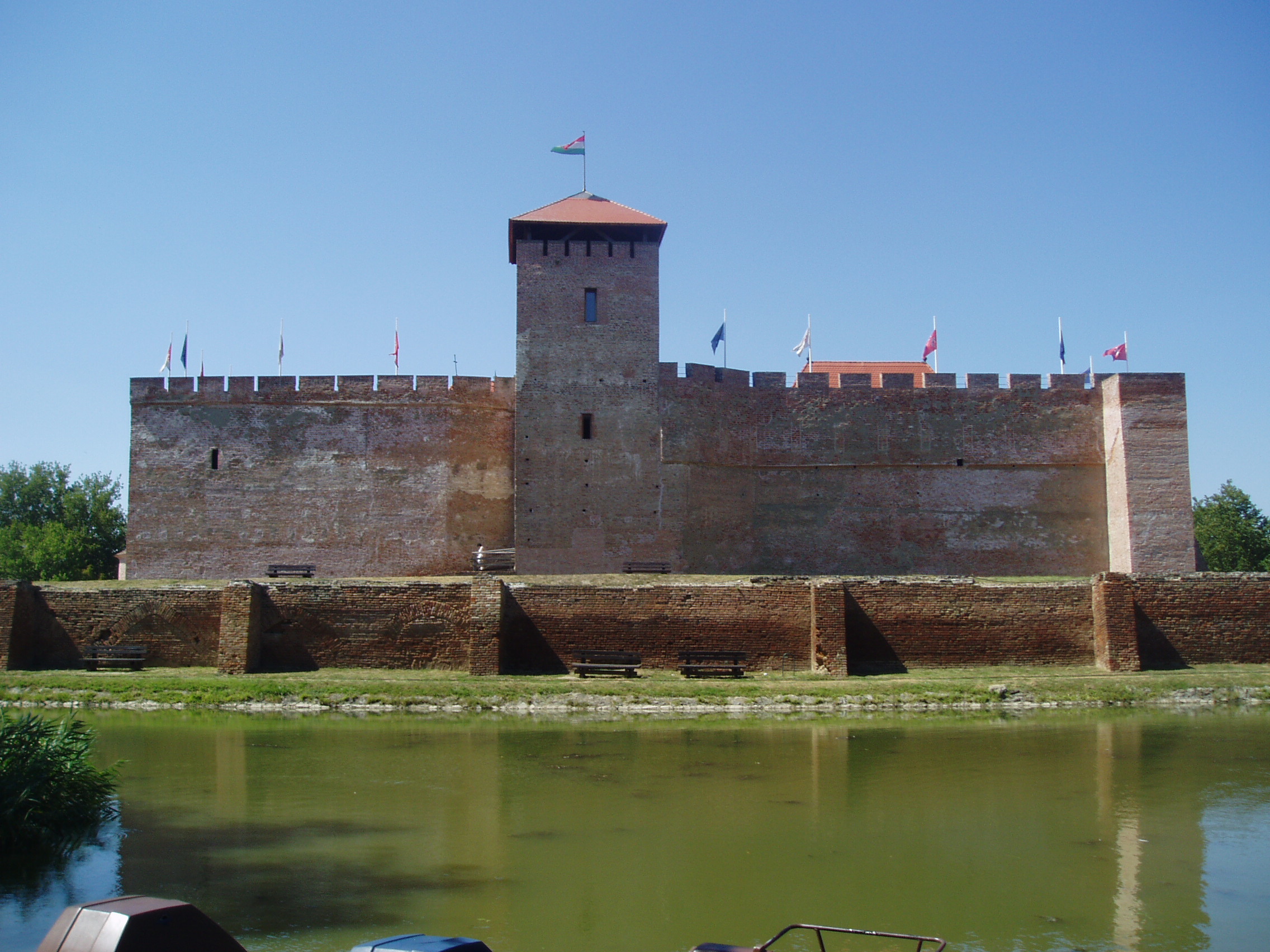Nyilvános 1129 | 1588 | Gyula, Vár | Az Alföld egyetlen középkori téglavárát a Maróthy család építtette a XV. század első felében. Derékvárának saroktornyát 1482 után Corvin János emeltette (ma eszpresszó és borozó működik benne). Corvin János, mint a trónöröklésből kiszorított herceg 1482 és 1504 között volt a vár ura, s feleségével, Frangepán Beatrix-szel együtt gyakran tartózkodott itt. Corvin János 150-ben bekövetkezett halála után özvegye állandóan Gyulán lakott. 1508-ban itt halt meg leánya, Corvin Erzsébet, a Hunyadi család utolsó sarja. 1543-ban a vár történelmi esemény színhelye volt: itt tartott közös országgyűlést Fráter György elnökletével az Erdéllyel határos nyolc alföldi megye nemessége. 1552-től a vár a török elleni végvári rendszer láncszeme lett és ó-olasz bástyás palánkvárrá alakították át. 1566-ban került török kézre, miután erősítés hiányában, kilenc heti ostrom után Kerecsényi László kapitány kénytelen volt feladni. Bár a török szabad elvonulást ígért, a maradék védőket a janicsárok megtámadták és lemészárolták, Kerecsényi kapitányt pedig foglyul ejtették és Nándorfehérváron kivégezték. A vár 1695-ig volt török kézen. Akkori állapotát megörökítette leírásában Evlia Cselebi török világutazó. A Rákóczi-szabadságharc után az ún. huszárvárat lerombolták, csak a belső vár maradt meg. Az épület déli sarkán Tóth Béla: Végvári vitéz című lovas szobra áll. A vár két bejárata közül a délkeleti oldalon van az ún. Kerecsényi kapu. A boltíve alatti két helyiségben a helyi hagyomány szerint Damjanich János és Lahner György tábornok volt elszállásolva 1849 augusztusában. A várudvar 1964 óta a Gyulai Várszínház előadásainak színhelye. A belső termekben a közelmúltban nyílt meg a Vármúzeum. A vár előtt az egykori vizesárok kiszélesítésével csónakázótavat létesítettek, melynek közepén tószínpadot alakítottak ki. A fénykép 2007 júliusában készült. Felh. irod.: Czeglédi Imre: Gyula útikalauz. 2. jav., bőv. kiad. Gyula, 1995 www.vendegvaro.hu www.gyula.hu |