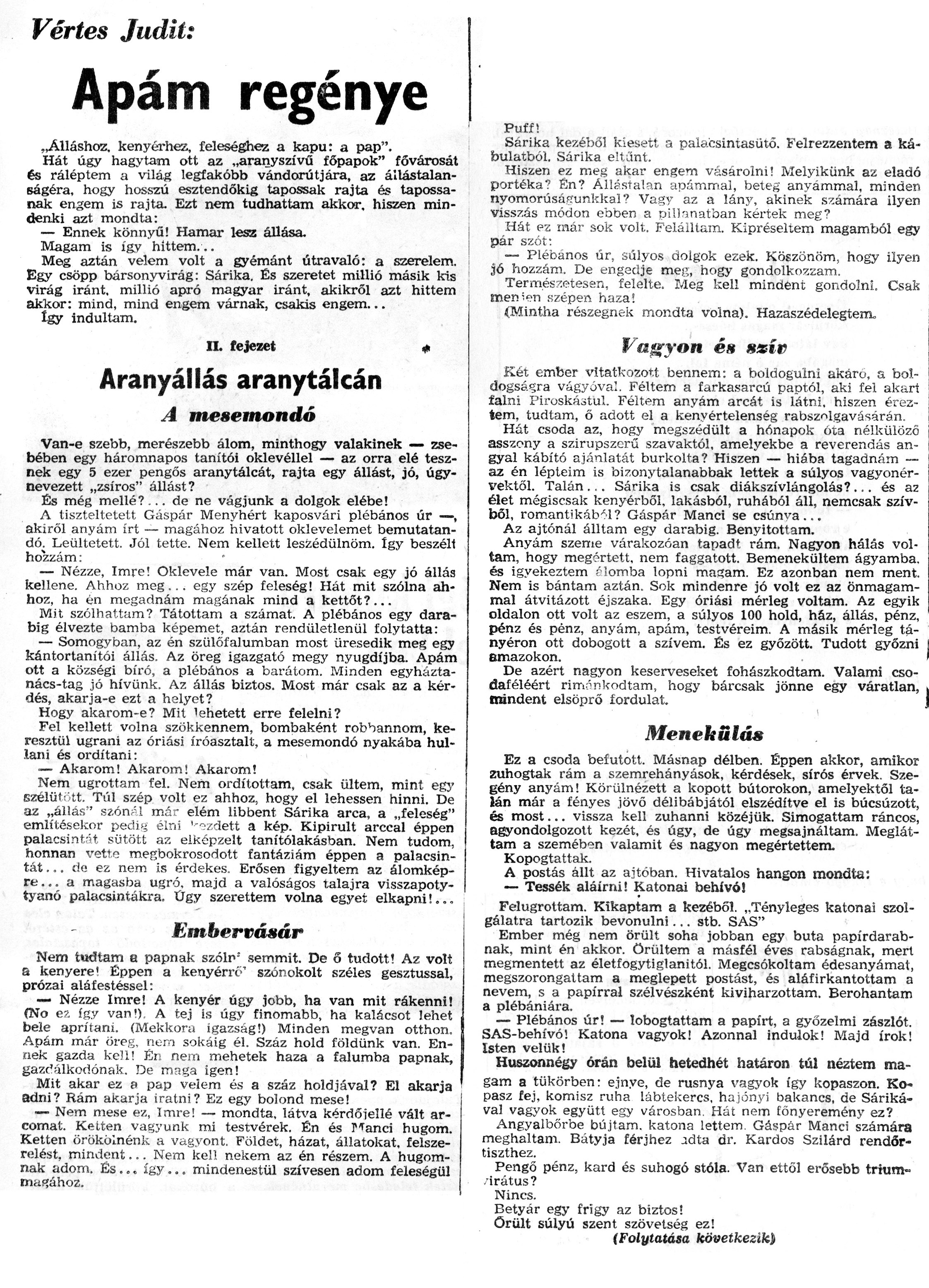 Nyilvános 925 | 1961 | Zalai Hírlap 1971.01.10. 008sz 08old - Apám regénye 02 | A következő szöveg a cikkből keletkezett automata szövegfelismertető segítségével: Vértes Judit: Apám regénye „Álláshoz, kenyérhez, feleséghez a kapu: a pap". Hát úgy hagytam ott az „aranyszívű főpapok" fővárosát és ráléptem a világ legfakóbb vándorútjára, az állástalanságéra, hogy hosszú esztendőkig tapossak rajta és tapossanak engem is rajta. Ezt nem tudhattam akkor, hiszen mindenki azt mondta: — Ennek könnyű! Hamar lesz állása. Magam is így hittem... Meg aztán velem volt a gyémánt útravaló: a szerelem. Egy csöpp bársonyvirág: Sárika. És szeretet millió másik kis virág iránt, millió apró magyar iránt, akikről azt hittem akkor: mind, mind engem várnak, csakis engem... Így indultam. n. fejezet # Aranyállás aranytálcán T A mesemondó Van-e szebb, merészebb álom, minthogy valakinek — zsebében egy háromnapos tanítói oklevéllel — az orra elé tesznek egy 5 ezer pengős aranytálcát, rajta egy állást, jó, úgynevezett „zsíros" állást? És még mellé?-., de ne vágjunk a dolgok elébe! A tiszteltetett Gáspár Menyhért kaposvári plébános úr —, akiről anyám írt — magához hivatott oklevelemet bemutatan-dó; Leültetett. Jól tette. Nem kellett leszédülnöm. így beszélt hozzám: — Nézze, Imre! Oklevele már van. Most csak egy jó állás kellene. Ahhoz meg... egy szép feleség! Hát mit szólna ahhoz, ha én megadnám magának mind a kettőt?... Mit szólhattam? Tátottam a számat. A plébános egy darabig élvezte bamba képemet, aztán rendületlenül folytatta: — Somogyban, az én szülőfalumban most üresedik meg egy kántortanítói állás. Az öreg igazgató megy nyugdíjba. Apám ott a községi bíró, a plébános a barátom. Minden egyháztanács-tag jó hívünk. Az állás biztos. Most már csak az a kérdés, akarja-e ezt a helyet? Hogy akarom-e? Mit \'ehetett erre felelni? Fel kellett volna szökkennem, bombaként robbannom, keresztül ugrani az óriási íróasztalt, a mesemondó nyakába hullani és ordítani: ■— Akarom! Akarom! Akarom! Nem ugrottam fel. Nem ordítottam, csak ültem, mint egy szélüt\'tt. Túl szép volt ez ahhoz, hogy el lehessen hinni. De az „állás" szómU már elém libbent Sárika arca, a „feleség" említésekor pedu» élni \'-°zdett a kép. Kipirult arccal éppen palacsintát sütött az elképzelt tanítólakásban. Nem tudom, honnan \\retto megbokrosodott fantáziám éppen a palacsintát ... da ez nem is érdekes. Erősen figyeltem az álomképre... a magasba ugró, majd a valóságos talajra visszapoty-tyanó palacsintákra. Ügy szerettem volna egyet elkapni!... Embervásár Nem tudtam a papnak szóin\' semmit. De 6 tudott! Az volt a kenyere\' Éppen a kenyérré\' szónokolt széles gesztussal, prózai aláfestéssel: — Nézze Imre! A kenyér úgy jobb, ha van mit rákenni! (No ez így van!), A tej is úgy finomabb, ha kalácsot lehet bele aprítani. (Mekkora igazság!) Minden megvan otthon. Apám már öreg, nem sokáig él. Száz hold földünk van. Ennek gazda kell! Én nem mehetek haza a falumba papnak, gazdálkodónak. De maga igen! Mit akar ez a pap velem és a száz holdjával? El akarja adni? Rám akarja íratni? Ez egy bolond mese! — Nem mese ez, Imre! — mondta, látva kérdőjellé vált arcomat. Kelten vagyunk mi testvérek. Én és Manci húgom. Ketten örökölnénk a vagyont. Földet, házat, állatokat, felszerelést, mindent... Nem kel! nekem az én részem. A húgomnak adom. És ... így... mindenestül szívesen adom feleségül niaf?ához. Puff! Sárika kezéből kiesett a palacsintasütő. Felrezzentem a ká-foulatból. Sárika eltűnt. Hiszen ez meg akar engem vásárolni! Melyikünk az eladó portéka? Én? Állástalan apámmal, beteg anyámmal, minden nyomorúsáfrunkkal ? Vagy az a lány, akinek számára ilyen visszás módon ebben a pillanatban kértek meg? Hát ez már sok volt. Felálltam. Kipréseltem magamból egy pár szót: — Plébános űr, súlyos dolgok ezek. Köszönöm, hogy ilyen jő hozzám. De engedje meg, hogy gondolkozzam. Természetesen, felelte. Meg kell mindent gondolni. Csak menien szépen haza! {Mintha részegnek mondta volna). Hazaszédelegtera, Vagyon és ssív : \'■ \' Két ember vitatkozott bennem: a boldogulni akáro, a boldogságra vágyóvá\'.. Féltem a farkasarcú paptól, aki fel akart falni Piroskástul. Féltem anyám arcát is látni, hiszen éreztem, tudtam, ő adott el a kenyértelenség rabszolgavásárán. Hát csoda az, hogy megszédült a hónapok óta nélkülöző asszony a szirupszerű szavaktól, amelyekbe a reverendás angyal kábító ajánlatát burkolta? Hiszen — hiába tagadnám — az én lépteim is bizonytalanabbak lettek a súlyos vagyonér-vektől. Talán.,. Sárika is csak diákszívlángolás?... és az élet mégiscsak kenyérből, lakásból, ruhából áll, nemcsak szívből, romantikából? Gáspár Manci se csúnva ... Az ajtónál álltam egy darabig. Benyitottam. Anyám szeme várakozóan tapadt rám. Nagyon hálás voltam, hogy megértett, nem faggatott. Bemenekültem ágyamba. és igyekeztem f Somba lopni masam. Ez azonban nem ment. Nem is bántam aztán. Sok mindenre jó volt ez az önmagámmal átvitázott éjszaka. Egy óriási mérleg voltam. Az egyik oldalon ott volt az eszem, a súlyos 100 hold, ház, állás, pénz, pénz és pénz, anyám, apám, testvéreim. A másik mérleg tányéron ott dobogott a szívem. És ez győzött. Tudott győzni amazokon. De azért nagyon keserveseket fohászkodtam. Valami csodaféléért rimőnkodtam, hogy bárcsak jönne egy váratlan, mindent elsöprő fordulat. i Menekülő* Ez a csoda befutott. Másnap délben. Éppen akkor, amikor zuhogtak rám a szemrehányások, kérdések, sírós érvek. Szegény anyám! Körülnézett a kopott bútorokon, amelyektől talán már a fényes jövő délib