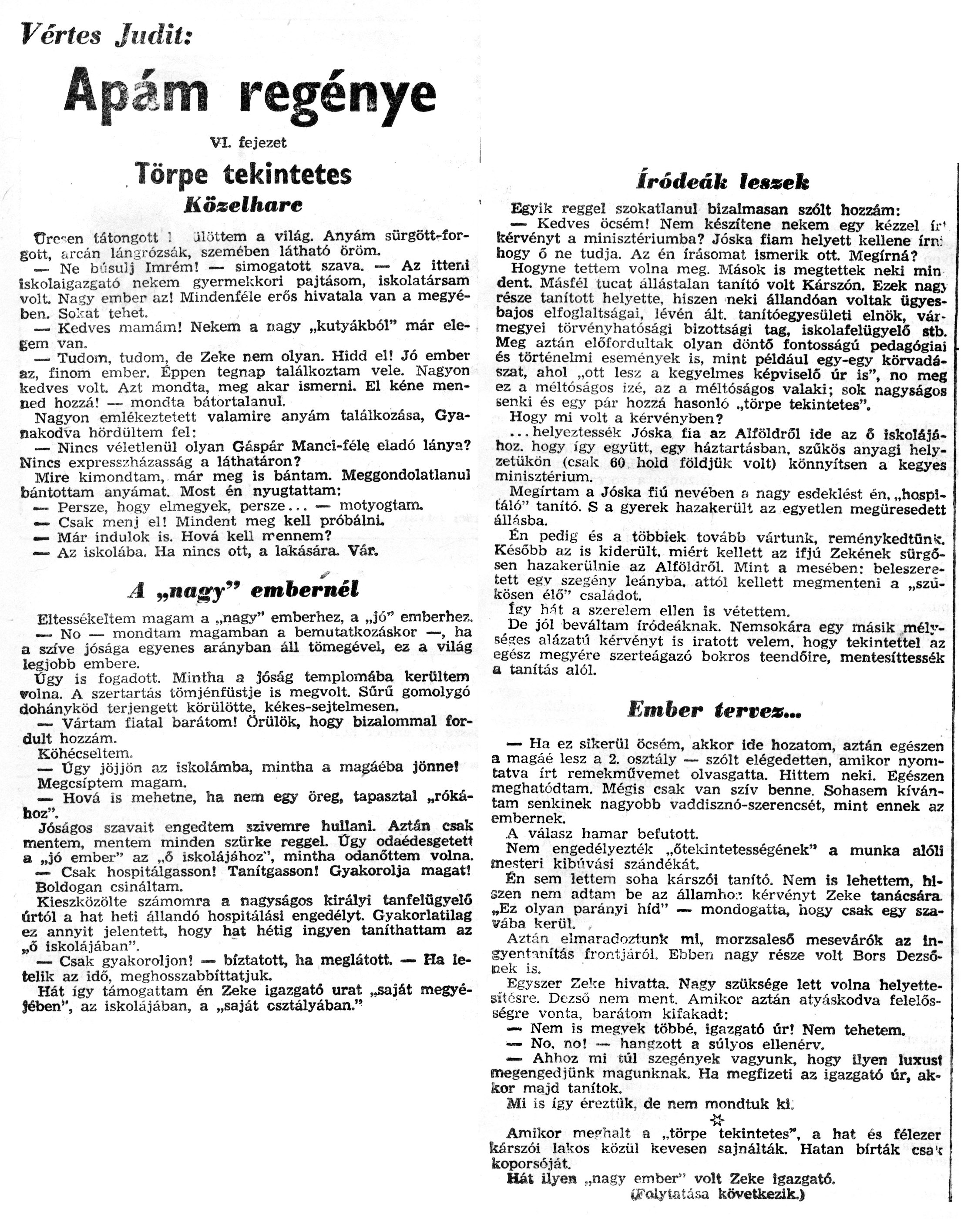 Nyilvános 1065 | 2106 | Zalai Hírlap 1971.01.24. 020sz 08old - Apám regénye 04 | A következő szöveg a cikkből keletkezett automata szövegfelismertető segítségével: Vértes Judit: Apám regénye VI. fejezet Törpe tekintetes {■ Közelharc ürc-en tátongott ! jlöttem a világ. Anyám sürgött-for-gott, arcán lángrózsák, szemében látható öröm. — Ne búsulj Imrém! — simogatott szava. — Az itteni iskolaigazgató nekem gyermekkori pajtásom, iskolatársam volt Nagy ember az! Mindenféle erős hivatala van a megyében. So\'^at tehet. ..... __ Kedves mamám! Nekem a nagy „kutyákból" mar elegem van. __Tudom, tudom, de Zeke nem olyan. Hidd el! Jó ember az, finom ember. Éppen tegnap találkoztam vele. Nagyon kedves volt. Azt mondta, meg akar ismerni. El kéne menned hozzá! — mondta bátortalanul. Nagyon emlékeztetett valamire anyám találkozása, Gyanakodva hördültem fel: — Nincs véletlenül olyan Gáspár Manci-féle eladó lánya? Nincs expresszházasság a láthatáron? Mire kimondtam, már meg is bántam. Meggondolatlanul bántottam anyámat. Most én nyugtattam: __ Persze, hogy elmegyek, persze... — motyogtam. — Csak menj el! Mindent meg kell próbálni. — Már indulok is. Hová kell rrennem? — Az iskolába. Ha nincs ott, a lakására. Vár. __ \' A „nagy" embernél Eltessékeltem magam a „nagy" emberhez, a „jó" emberhez. __ No — mondtam magamban a bemutatkozáskor —, ha a szíve jósága egyenes arányban áll tömegével, ez a világ legjobb embere. | Ügy is fogadott. Mintha a jóság templomába kerültem volna. A szertartás tömjénfüstje is megvolt. Sűrű gomolygó dohányköd terjengett körülötte, kékes-sejtelmesen. — Vártam fiatal barátom! örülök, hogy bizalommal fordult hozzám. Köhécseltem. — Ügy jöjjön az iskolámba, mintha a magáéba jönne! Megcsíptem magam. — Hová is mehetne, ha nem egy öreg, tapasztal „rókához". Jóságos szavait engedtem szivemre hullani. Aztán csak mentem, mentem minden szürke reggel. Ügy odaédesgetett a „jó ember" az „6 iskolájához", mintha odanőttem volna. — Csak hospitálgasson! Tanítgasson! Gyakorolja magát! Boldogan csináltam. Kieszközölte számomra a nagyságos királyi tanfelügyelő úrtól a hat heti állandó hospitálási engedélyt. Gyakorlatilag ez annyit jelentett, hogy hat hétig ingyen taníthattam az „ő iskolájában". — Csak gyakoroljon! — bíztatott, ha meglátott. — Ha letelik az idő, meghosszabbíttatjuk. Hát így támogattam én Zeke igazgató urat „saját megyéjében", az iskolájában, a „saját osztályában." íródeák lessek Egyik reggel szokatlanul bizalmasan szólt hozzám: — Kedves öcsém! Nem készítene nekem egy kézzel ír\' kérvényt a minisztériumba? Jóska fiam helyett kellene írn: hogy ő ne tudja. Az én írásomat ismerik ott. Megírná? Hogyne tettem volna meg. Mások is megtettek neki min dent. Másfél tucat állástalan tanító volt Kárszón. Ezek nag> része tanított helyette, hiszen neki állandóan voltak ügyesbajos elfoglaltságai, lévén ált. tanítóegyesületi elnök, vármegyei törvényhatósági bizottsági tag, iskolafelügyelő stb. Meg aztán előfordultak olyan döntő fontosságú pedagógiai és történelmi események is, mint például egy-egy körvadászat, ahol „ott lesz a kegyelmes képviselő úr is", no meg ez a méltóságos izé, az a méltóságos valaki; sok nagyságos senki és egy pár hozzá hasonló ..törpe tekintetes". Hogy mi volt a kérvényben? ... helyeztessék Jóska fia az Alföldről ide az ő iskolájához, hogy így együtt, egy háztartásban, szűkös anyagi helyzetükön (csak 60 hold földjük volt) könnyítsen a kegyes minisztérium. Megírtam a Jóska fiú nevében a nagy esdeklést én. „hospl-táló" tanító. S a gyerek hazakerült az egyetlen megüresedett állásba. Én pedig és a többiek tovább vártunk, reménykedtünk Később az is kiderült, miért kellett az ifjú Zekének sürgősen hazakerülnie az Alföldről. Mint a mesében: beleszeretett egv szegény leányba, attól kellett megmenteni a „szűkösen élő" csaladot. íey h.-ít a szerelem ellen is vétettem. De jól beváltam íródeáknak. Nemsokára egy másik mélységes alázat\'í kérvényt is íratott velem, hogy tekintettel az egész megyére szerteágazó bokros teendőire, mentesíttessék a tanítás alól. Ember tertex... — Ha ez sikerül öcsém, akkor ide hozatom, aztán egészen a magáé lesz a 2. osztály — szólt elégedetten, amikor nyomtatva írt remekművemet olvasgatta. Hittem neki. Egészen meghatódtam. Mégis csak van szív benne. Sohasem kívántam senkinek nagyobb vaddisznó-szerencsét, mint ennek az embernek. A válasz hamar befutott. Nem engedélyezték „őtekintetességének" a munka alóli mesteri kibúvási szándékát. Én sem lettem soha kárszói tanító. Nem is lehettem, hiszen nem adtam be az államho:\'. kérvényt Zeke tanácsára. „Ez olyan parányi híd" — mondogatta, hogy csak egy szavába kerül. Aztán elmaradoztunk ml, morzsaleső mesevárók az in-gyentnnítás frontjáról. Ebben nagy része volt Bors Dezsőnek is. Egyszer "eke hivatta. Nagy szüksége lett volna helyettesítésre. Dezső nem ment. Amikor aztán atyáskodva felelősségre vonta, barátom kifakadt: — Nem is megyek többé, igazgató úr! Nem tehetem. — No. no! — hangzott a súlyos ellenérv. •— Ahhoz mi túl szegények vagyunk, hogy ilyen luxust megengedjünk magunknak. Ha megfizeti az igazgató úr, ak-ísor majd tanítok. Mi is így éreztük, de nem mondtuk ki: Amikor me«"nalt a „törpe tekintetes", a hat és félezer kárszói lakos közül kevesen sajnálták. Hatan bírták csa\'c koporsóját. Hát ilyen „nagy ember" volt Zeke igazgató. (Folytatása következik.) |