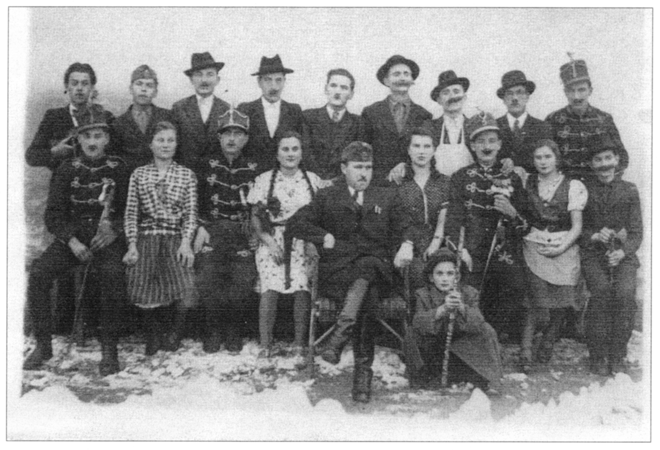 Nyilvános 1985 | 5419 | "A vén bakancsos... társulata" | Felső sor, balról: Horváth Rudolf, Révész István, Fleck József, Somogyi György, Pálmai László, Varga Lajos, Vajdai Károly, Dara József Alsó sor: Skoda Ferenc, Gyergyák Margit, Pusztai László, Gyergyák Anna, Vértes Imre, Vajdai Erzsébet, Somogyi Péter, Bedi Anna (Hajnalka), Sali László |