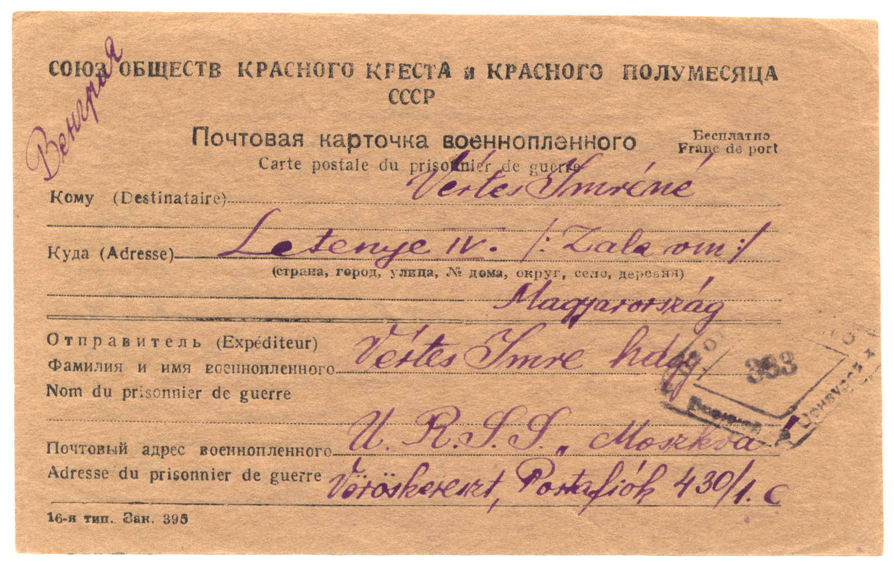 Nyilvános 1280 | 2329 | Vértes Imréné | Letenye IV. /Zala vm./ Magyarország Vértes Imre hdgy. U.R.S.S. "Moszkva" Vöröskereszt, Postafiók 430/1. c. 1946. nov. 15. Kicsike Kincseim! Csordultig a szívem! Sír, nevet! Első hír Rólatok: 2 júliusi, 1 augusztusi lap. Írj, írj sokat, sokszor! Levél, fénykép! Fizetés, állás, tantestület, káros stb.-ről. Támogatókról! (Meghálálom.) Kezdj naplót Magadról, Csöppikénkről. Gellért, Jutka írjatok Apukának ki forró szeretettel csókol Mindnyátokat és Karácsonyra, újévre, január 15-re, 19-re tanyai szerenád emlékdalaival üzen: "Csak egy kislány, ... akit én szeretek...!" Jött: 1947 áprl. 16. |
